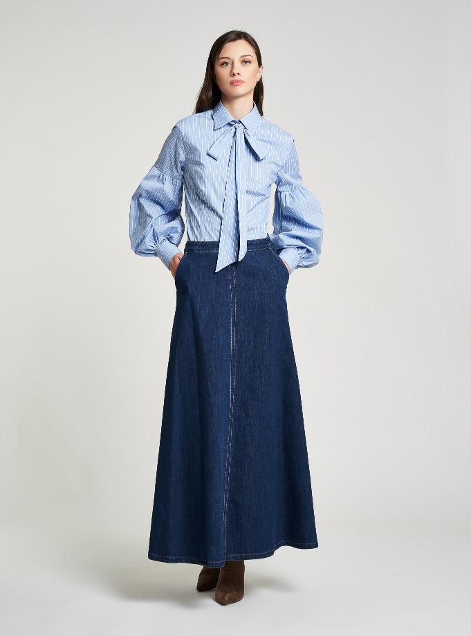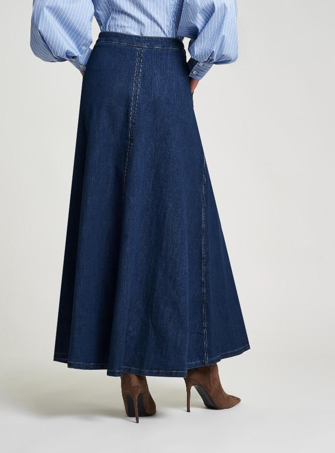 Long skirt, regular waistline, feminine volume. Slim fit at the top that contrasts with the wide wheel flare of the bottom. French pockets. Center cut front and back.