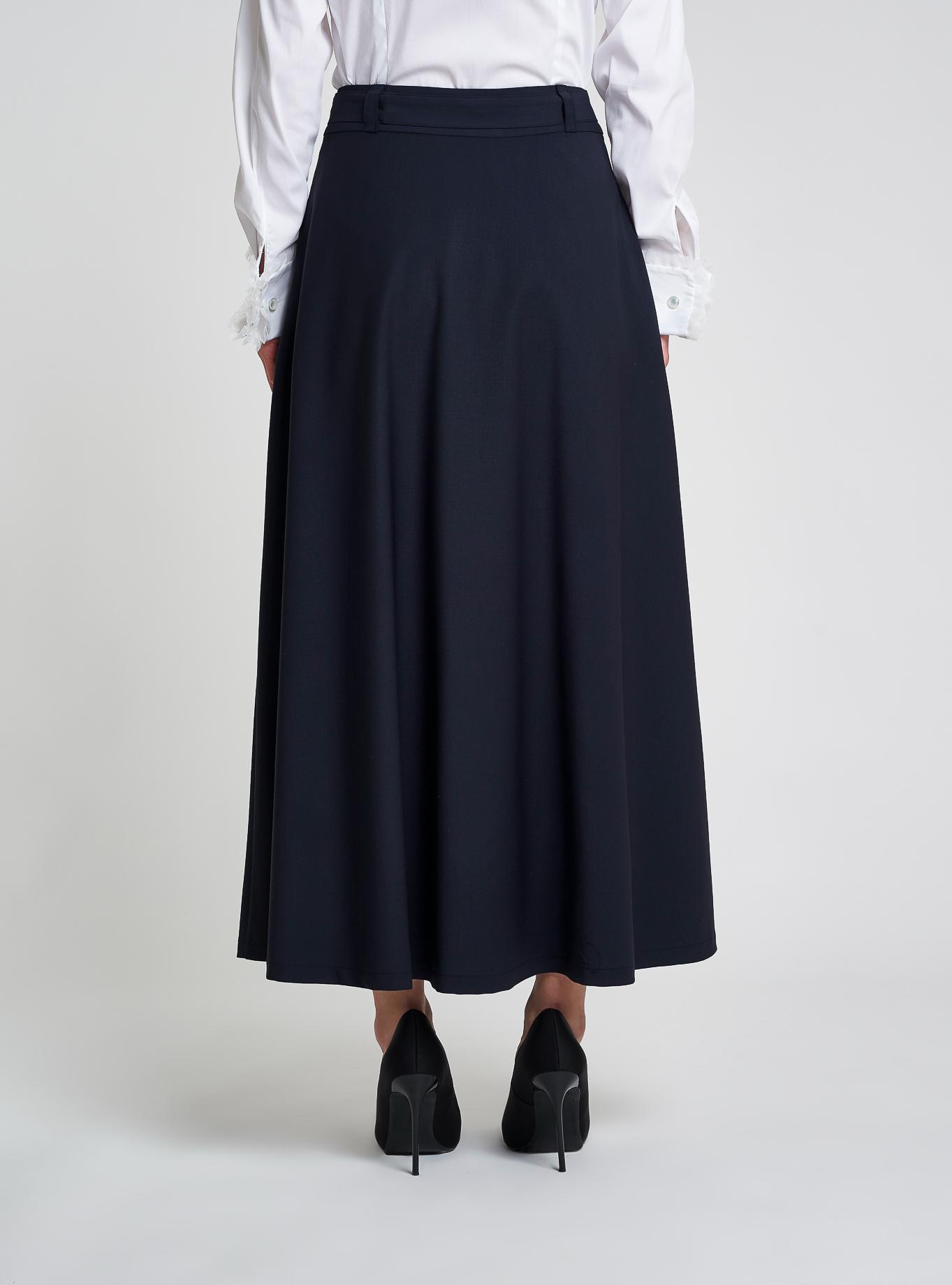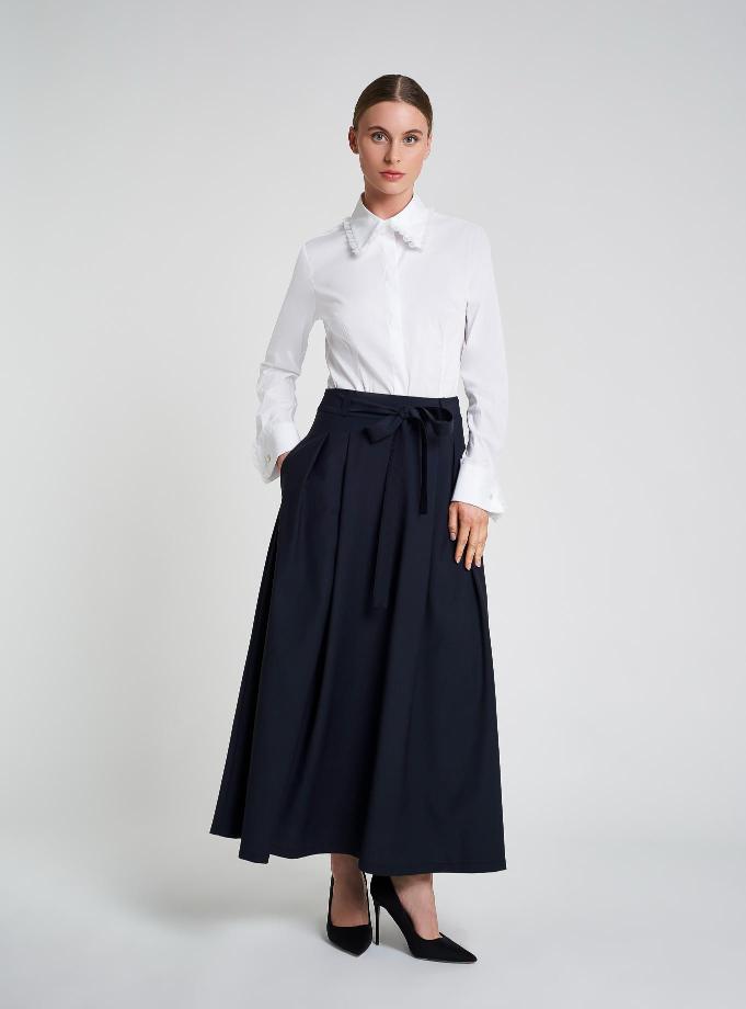 Long skirt with wide flare and waistband with belt loops. Pleat pattern and counter fold in front to give volume. Pockets inserted in the side. Matching belt in the same fabric to enrich the outfit.