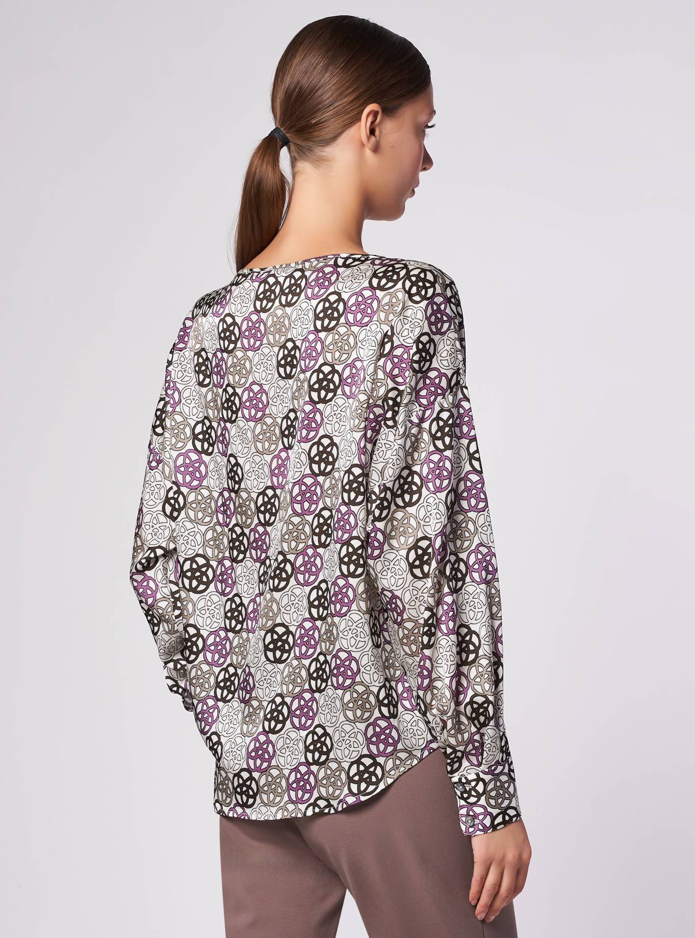 Loose fit blouse. Women's boat neckline. Dropped shoulder, regular long sleeves with cuff and a button. Even rim, medium-low hip length.