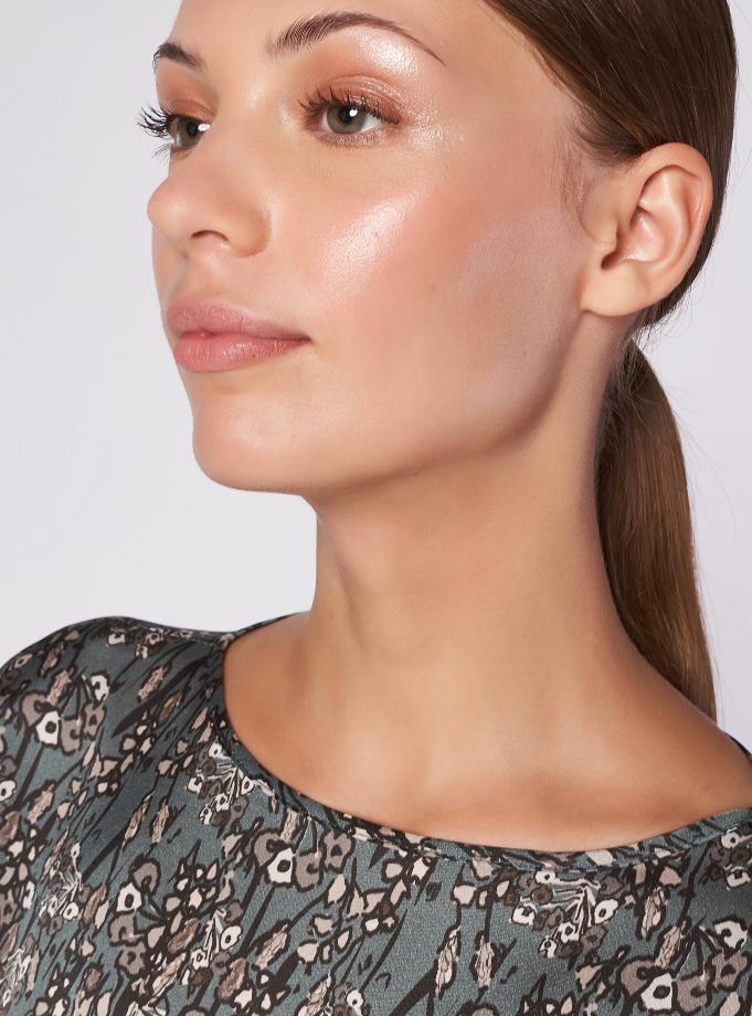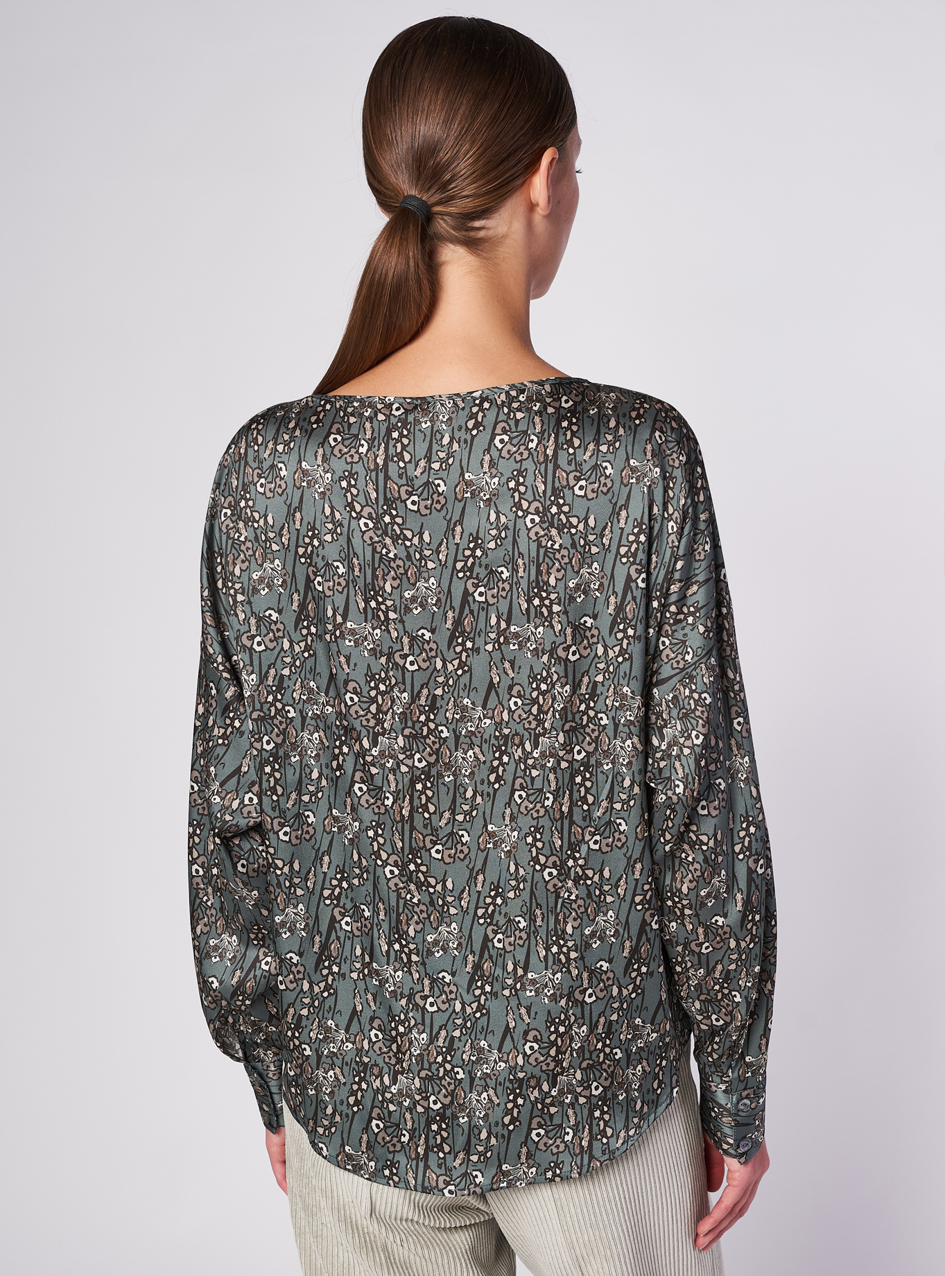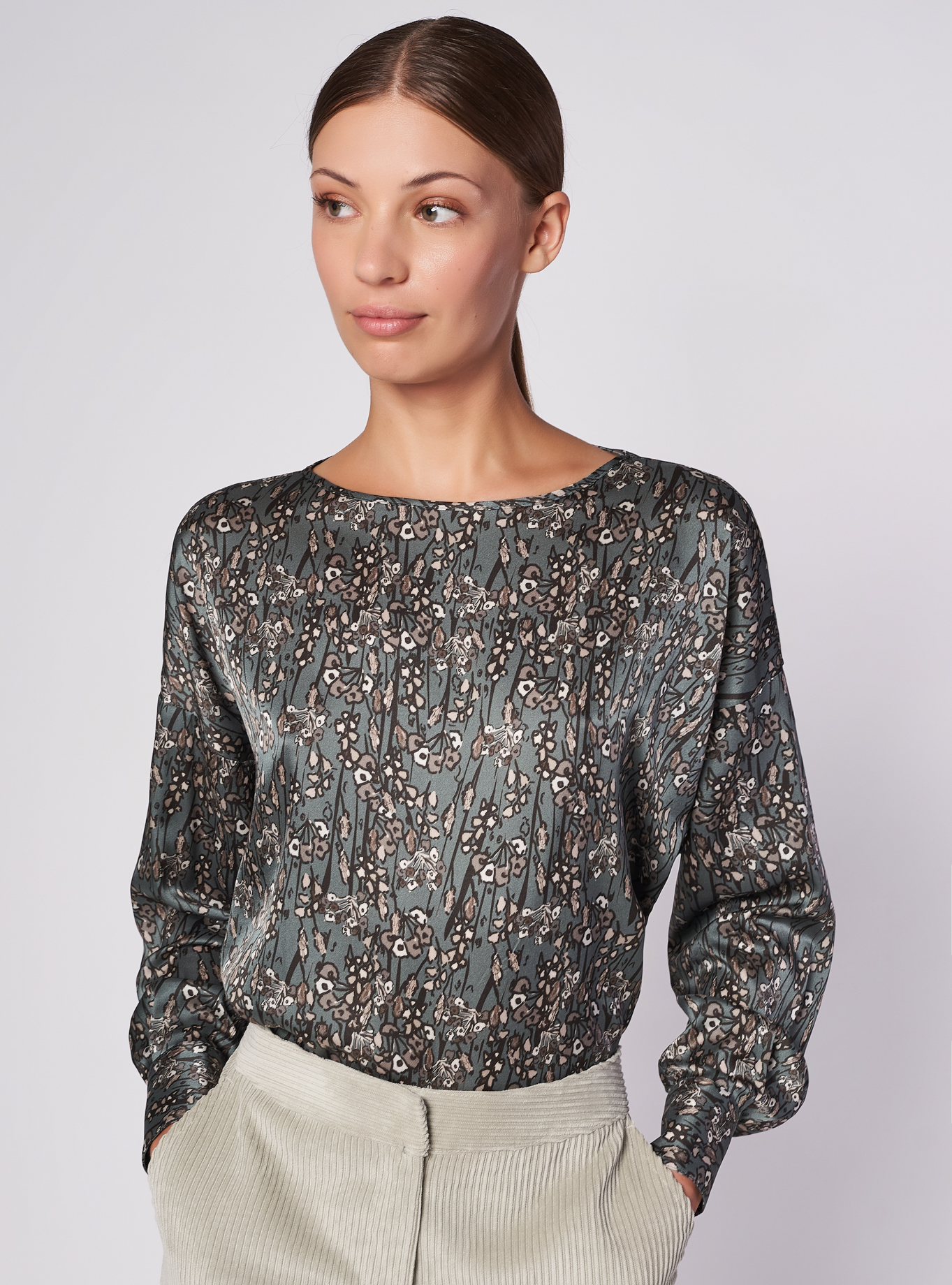 Loose fit blouse. Women's boat neckline. Dropped shoulder, regular long sleeves with cuff and a button. Even rim, medium-low hip length.