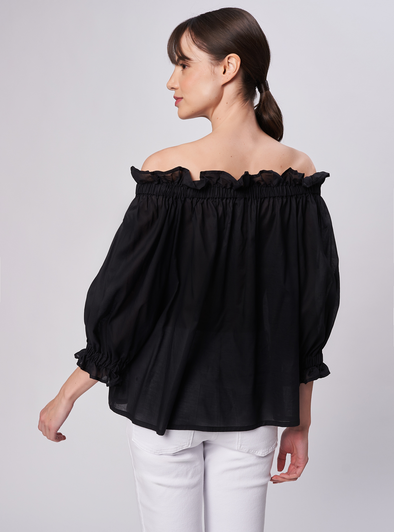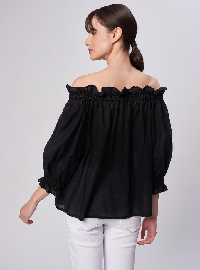 Feminine off-the-shoulder shirt with soft elastic and ruffles at the front and back, gathered at the shoulders to add volume to the sleeves. Wide 3/4-length puff sleeves with low elastic cuffs and ruffles. High hip length.