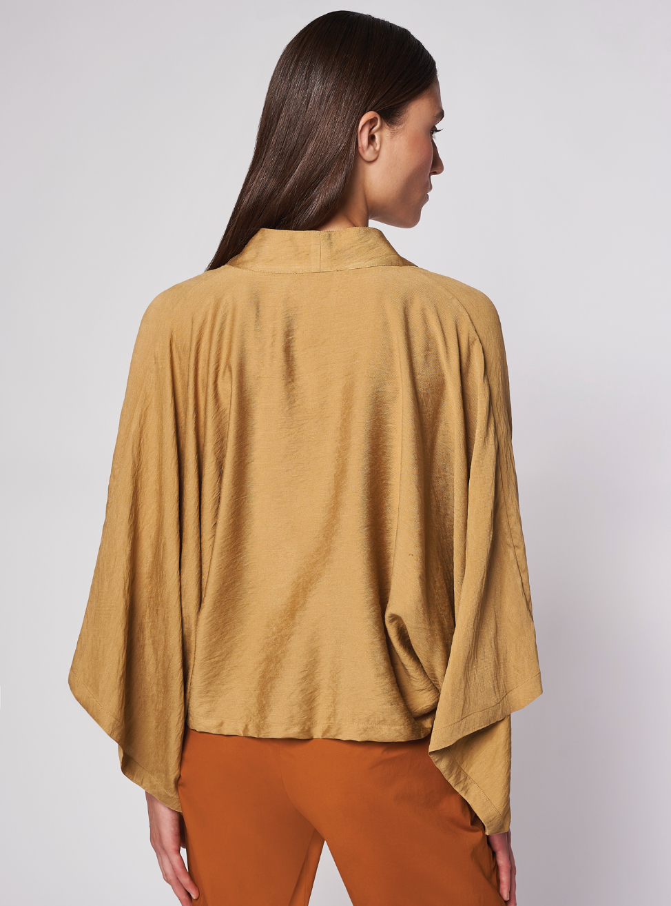 Oversized kimono blouse. Wide sleeves, feminine neckline with a hem, and a tie waist. High hip length.