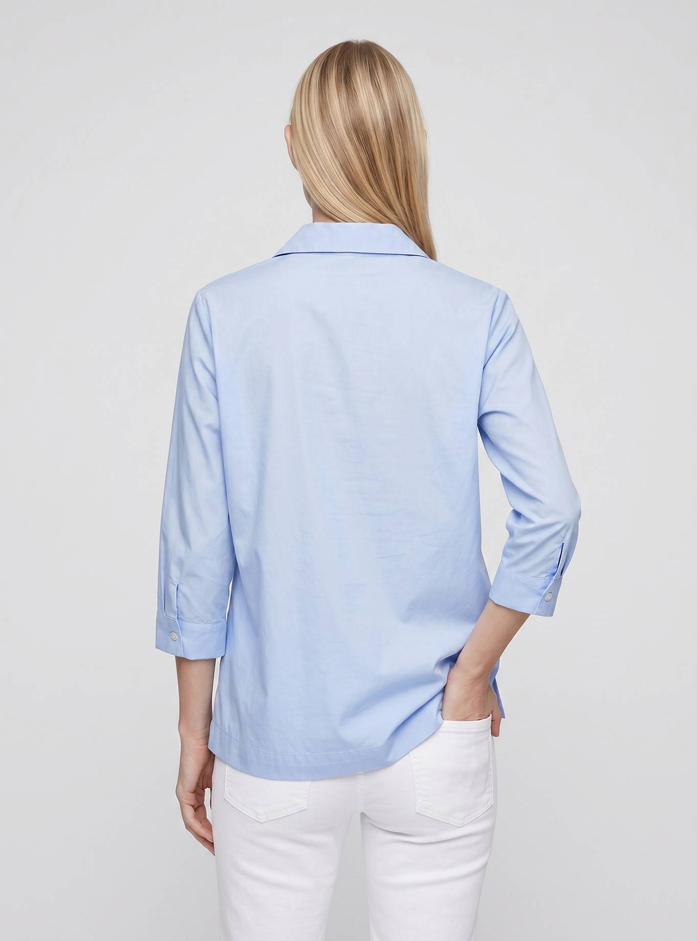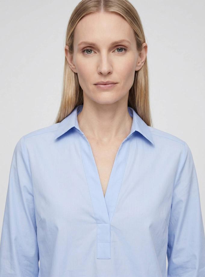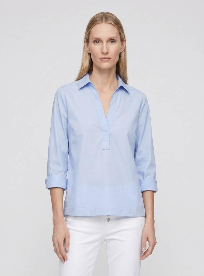 Relaxed-fit polo shirt. Shirt collar, feminine V-neck, regular 3/4-length sleeves with cuffs and side slits, level with the hem. High hip length.