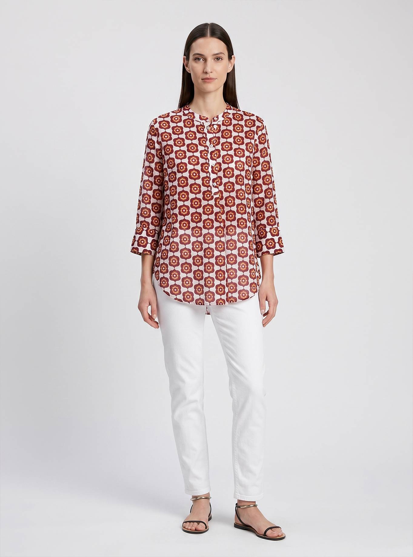 A-line blouse. Regular shoulder, wide 3/4 sleeve with high cuff and two buttons. Korean fastening with visible buttons. Yoke cut at the back, with deep counter pleat that gives volume. Rounded hem. Low hip length.