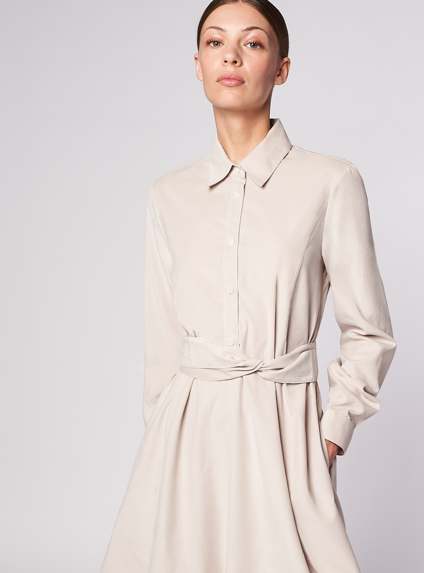 Semi-chemisier dress, regular fit with wide flare at the bottom. Regular shoulder with slightly puffed sleeves, cuff two buttons. Matching belt in the same fabric to enrich the look and emphasize the silhouette. Side panels on the front. Pockets inserted in the side. Yoke on the back. Long dress.