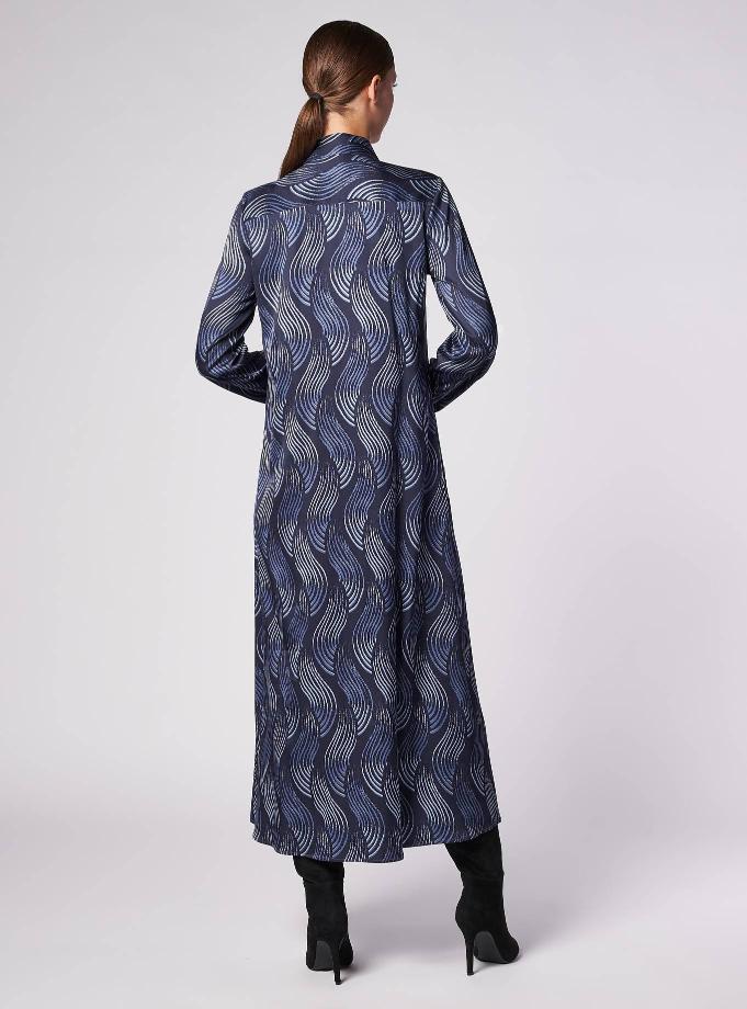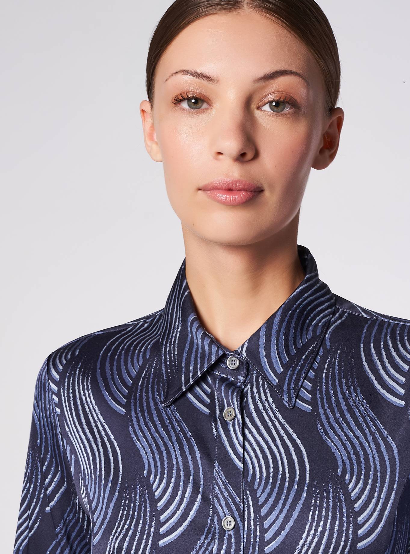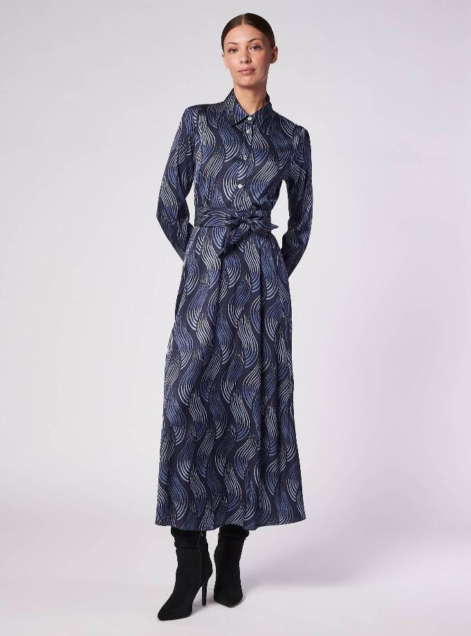 Semi-chemisier dress, regular fit with wide flare at the bottom. Regular shoulder with slightly puffed sleeves, cuff two buttons. Matching belt in the same fabric to enrich the look and emphasize the silhouette. Side panels on the front. Pockets inserted in the side. Yoke on the back. Long dress.