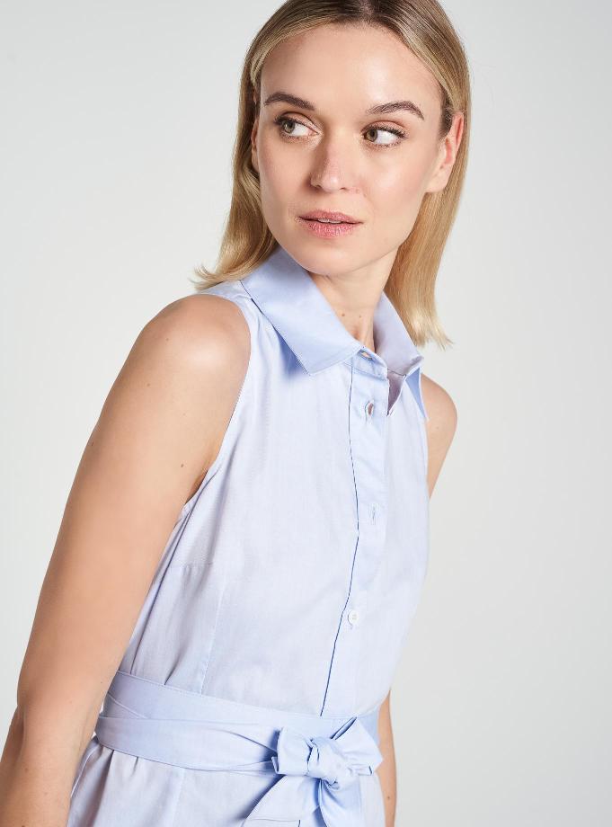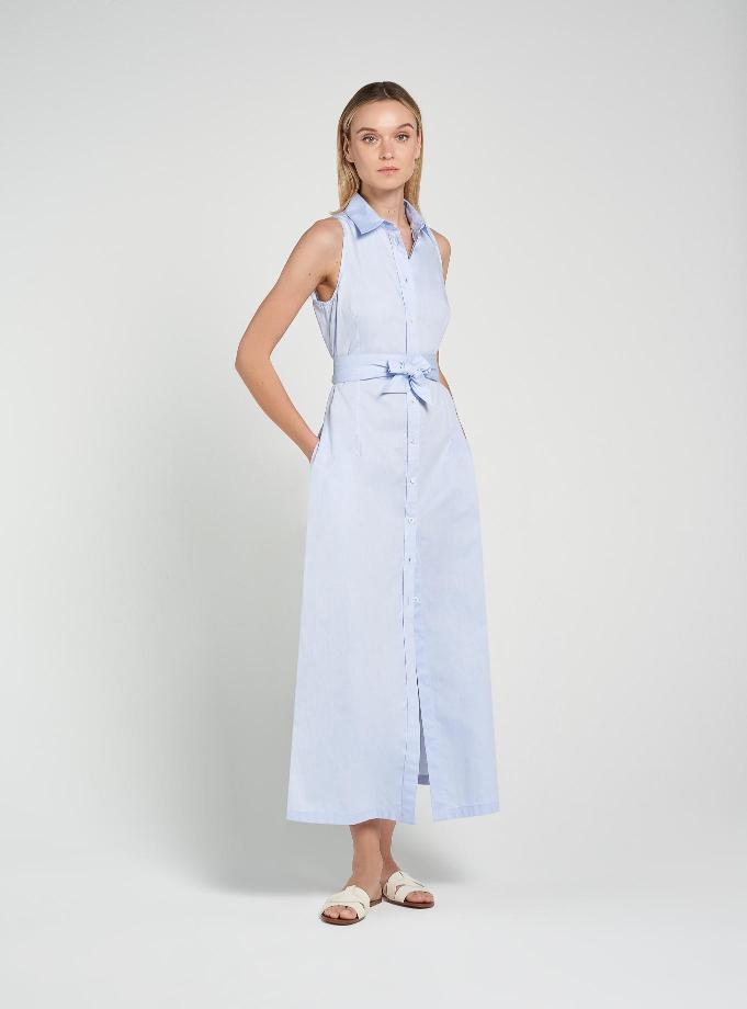Shirt dress, regular fit, slightly flared at the bottom with side slits. Shirt collar with V-neck and flat edge detail that creates pattern and continues throughout the placket. Pockets inserted in the side. Matching belt.
