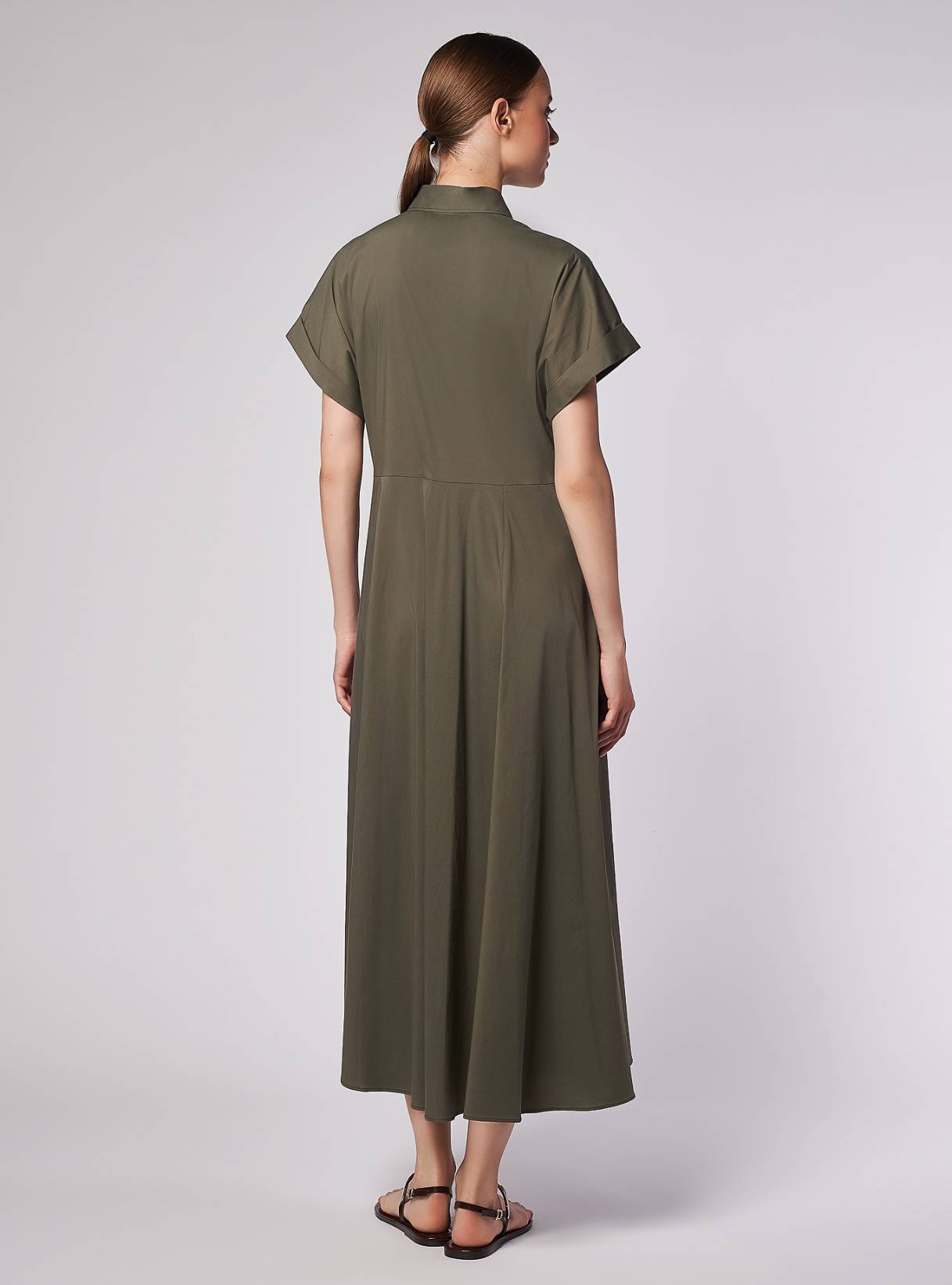 Long shirt dress, loose fit at the top, with a wide flare at the bottom. Short kimono sleeves with turn-ups. Inset side pockets. Matching belt. Long dress.