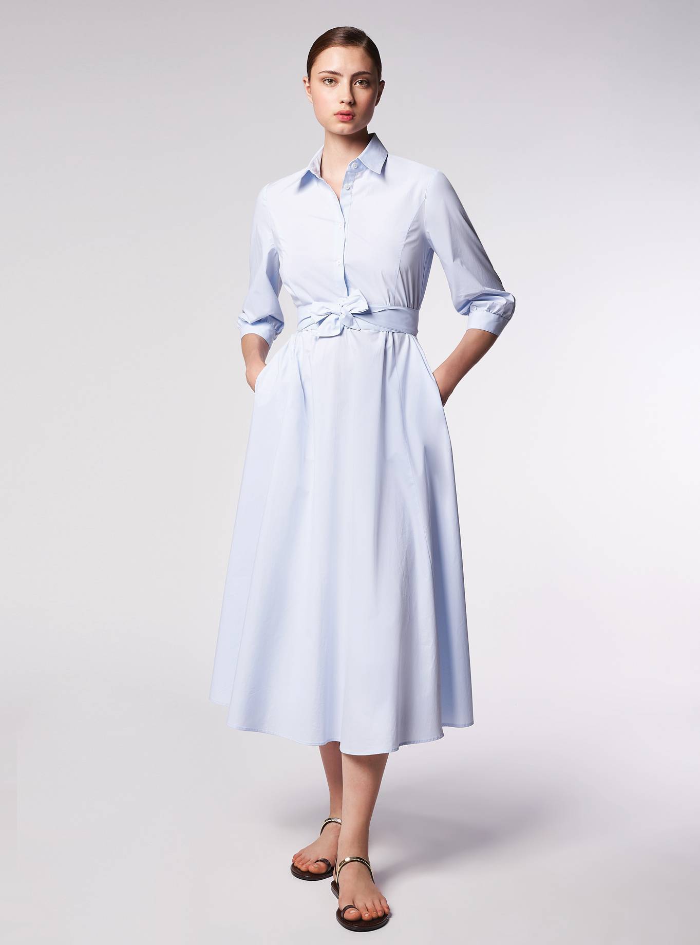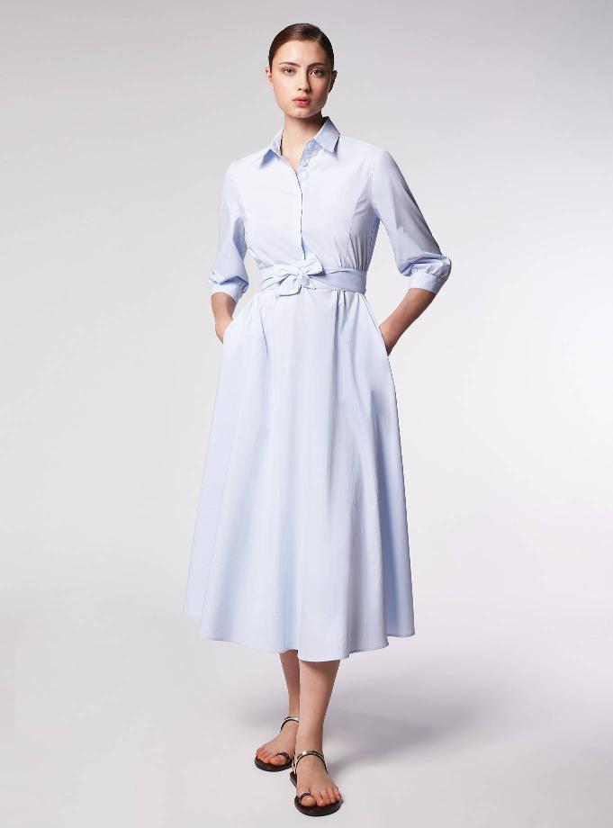 Long semi-shirt dress, regular fit, soft waist, and wide flared hem. A matching belt completes the look and accentuates the silhouette.