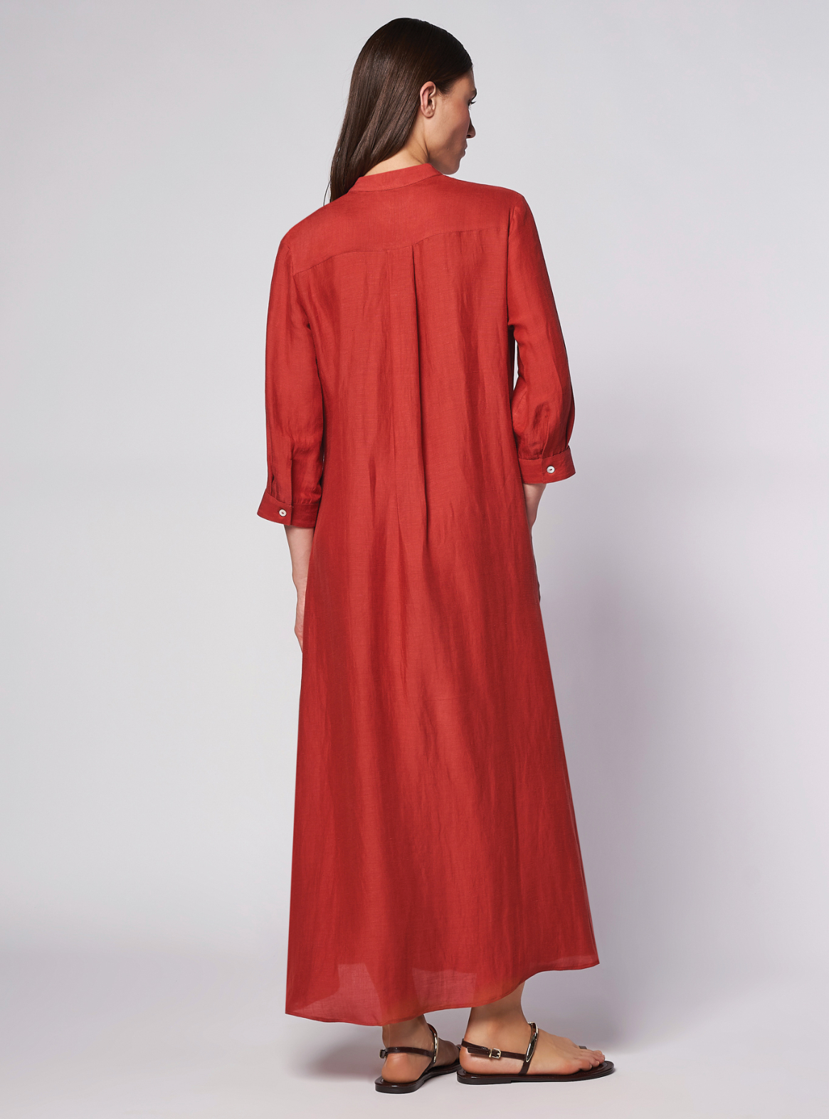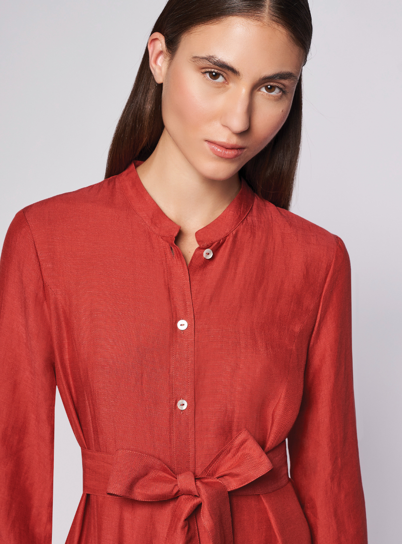 Long shirt dress with a mandarin collar. 3/4 sleeves. Loose fit, flared hem. A matching belt accentuates the waist.