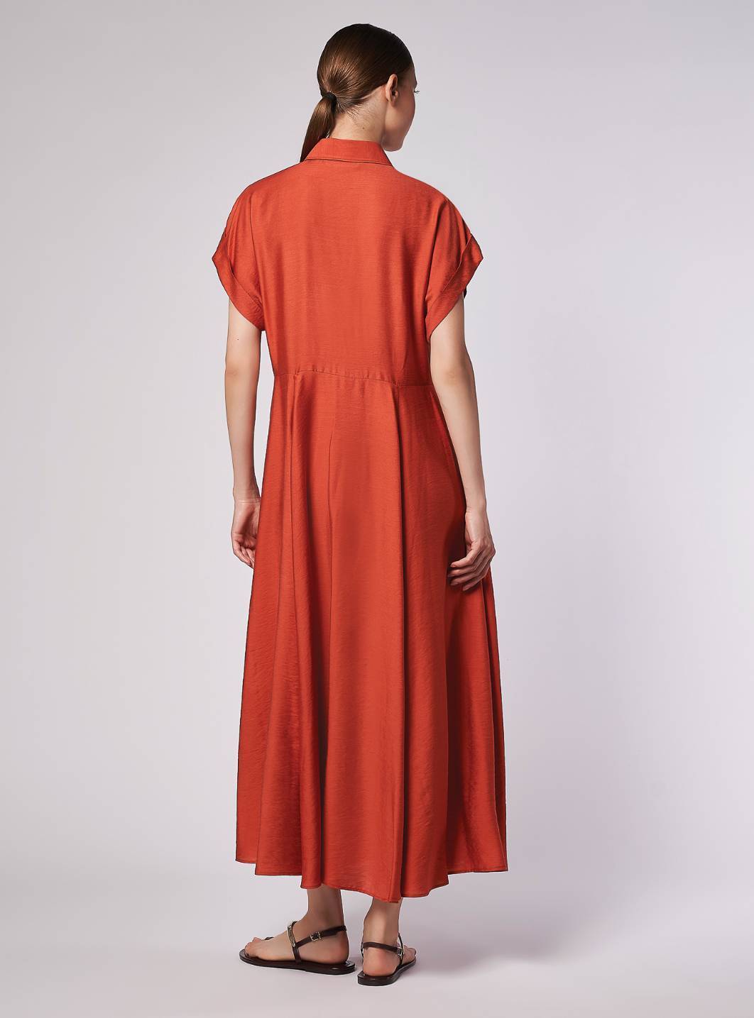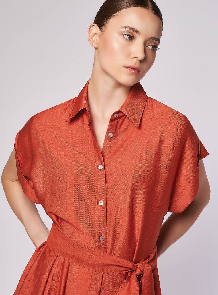 Long shirt dress, loose fit at the top, with a wide flare at the bottom. Short kimono sleeves with turn-ups. Inset side pockets. Matching belt. Long dress.