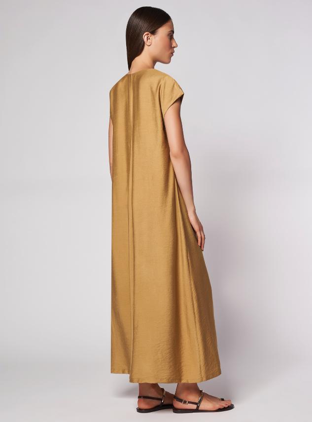 A-line dress with short kimono sleeves. A feminine V-neckline. Front pleat. Matching belt in the same fabric that ties at the waist.