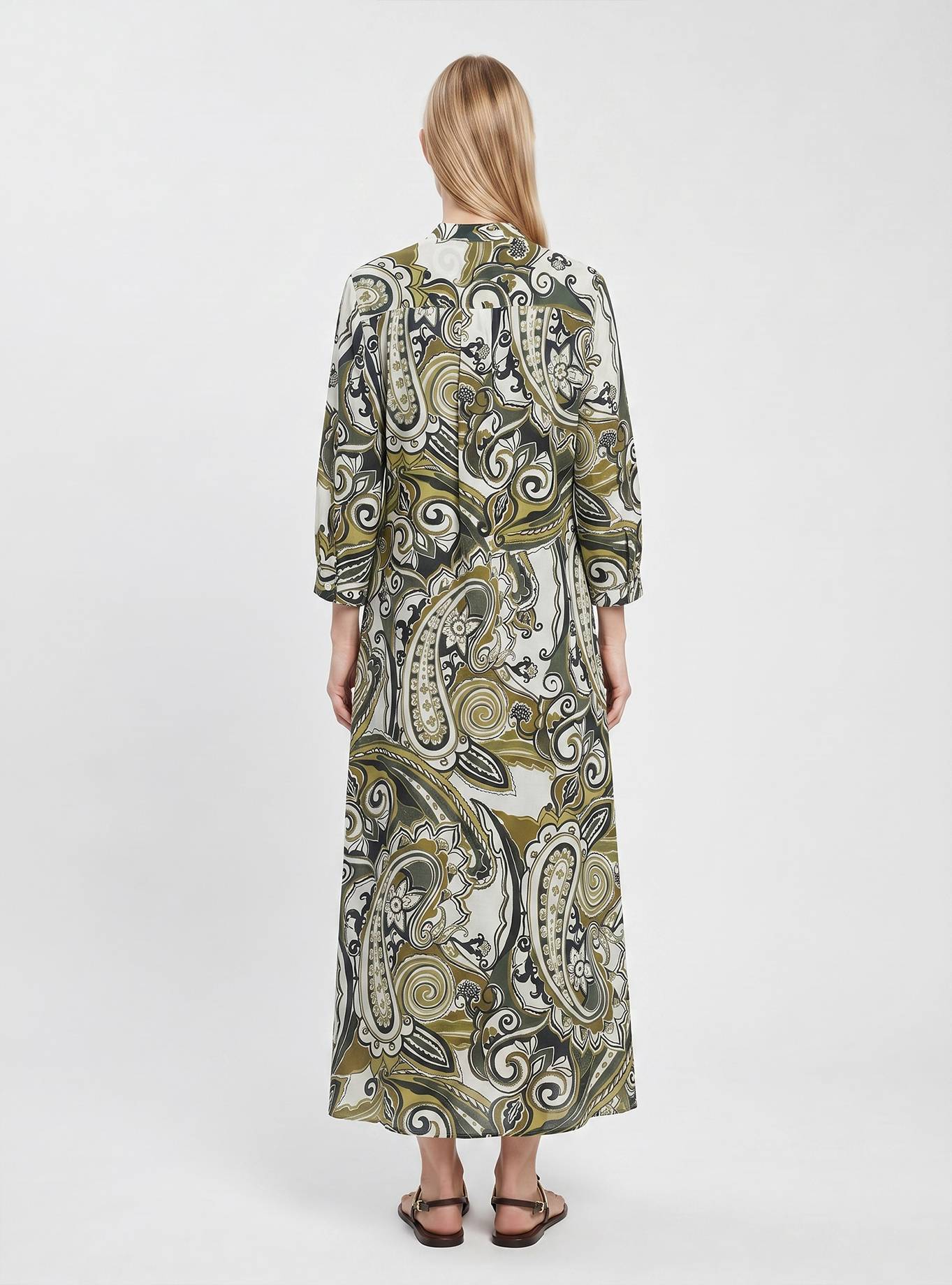 Long shirt dress with a mandarin collar. 3/4 sleeves. Loose fit, flared hem. A matching belt accentuates the waist.