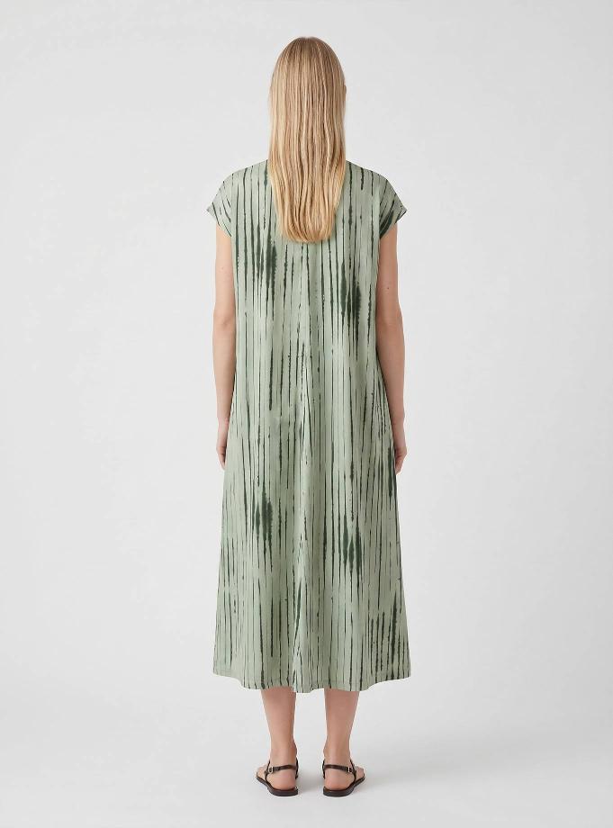 A-line dress with short kimono sleeves. A feminine V-neckline. Front pleat. Matching belt in the same fabric that ties at the waist.
