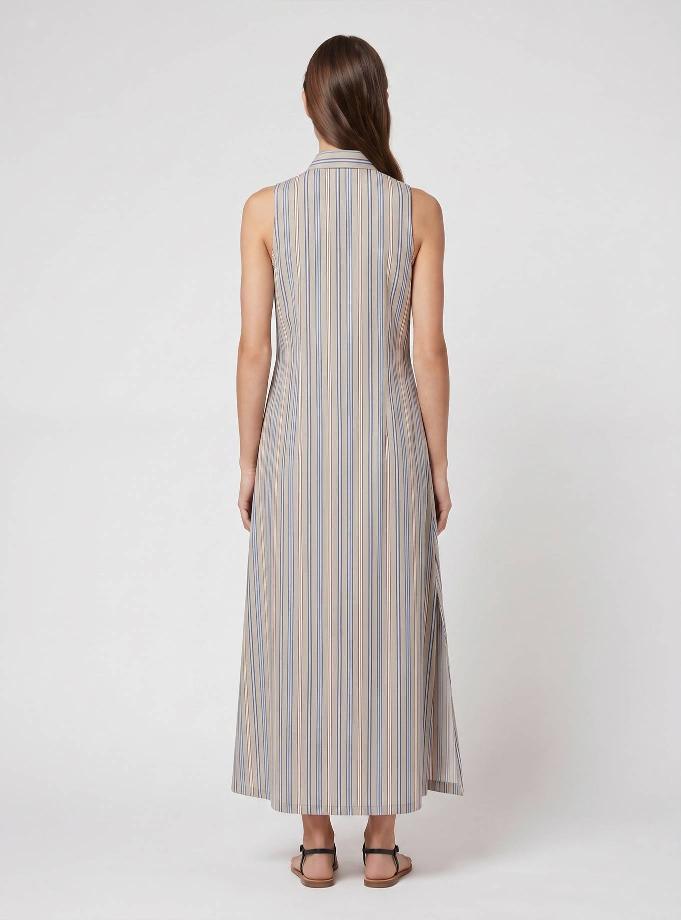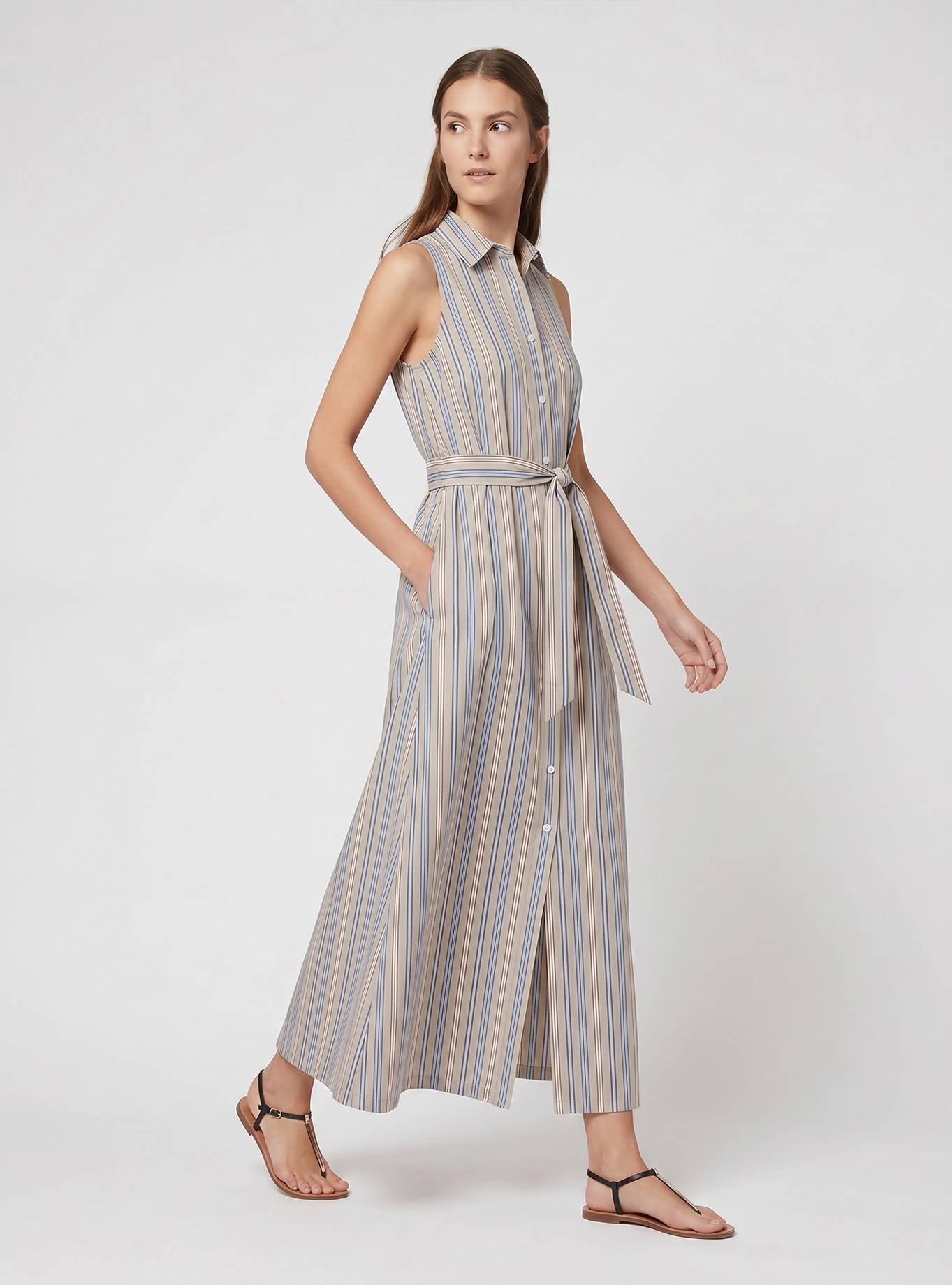 A-line shirt dress with flared hem and side slits. Shirt collar. Sleeveless. Matching belt in the same fabric to tie at the waist to accentuate the silhouette. Long dress.