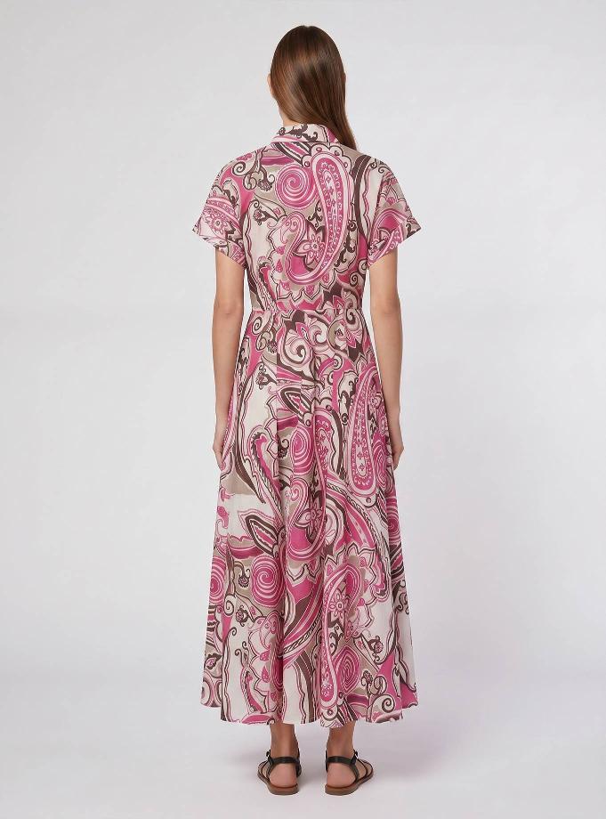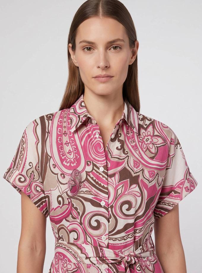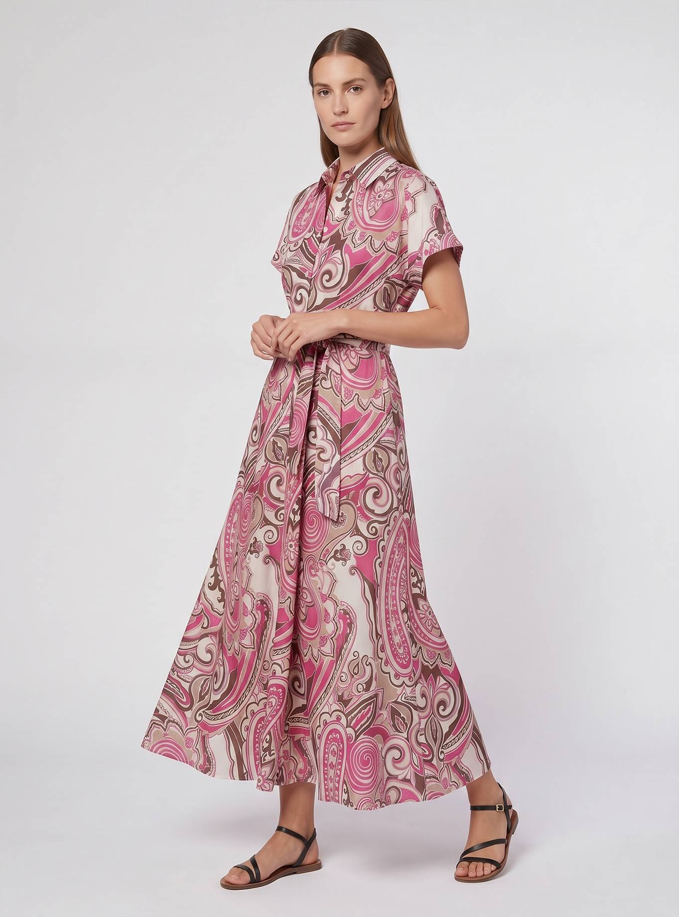 Long shirt dress, loose fit at the top, with a wide flare at the bottom. Short kimono sleeves with turn-ups. Inset side pockets. Matching belt. Long dress.