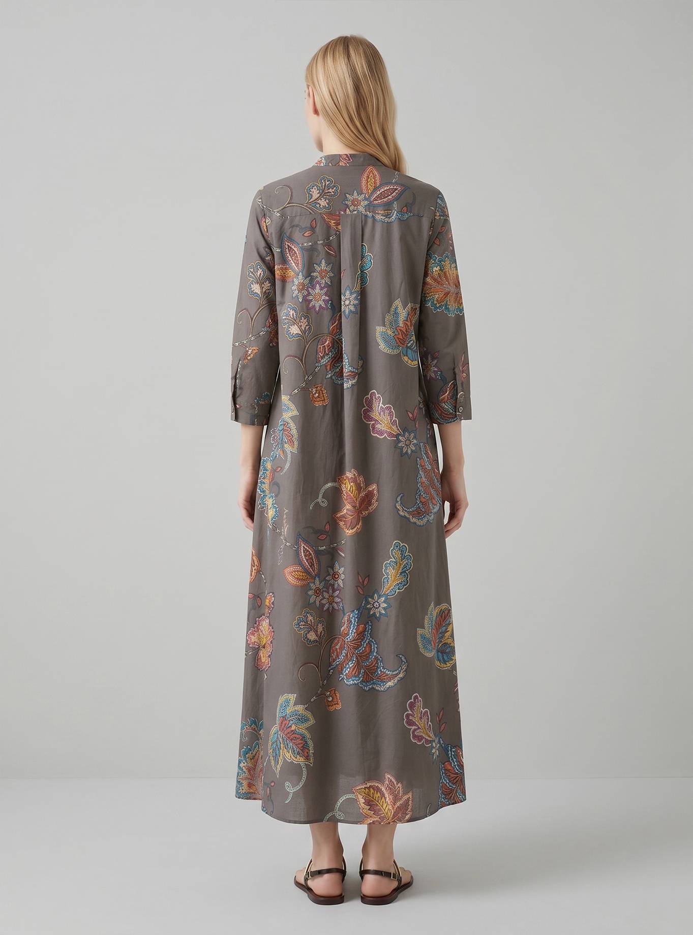Long shirt dress with a mandarin collar. 3/4 sleeves. Loose fit, flared hem. A matching belt accentuates the waist.