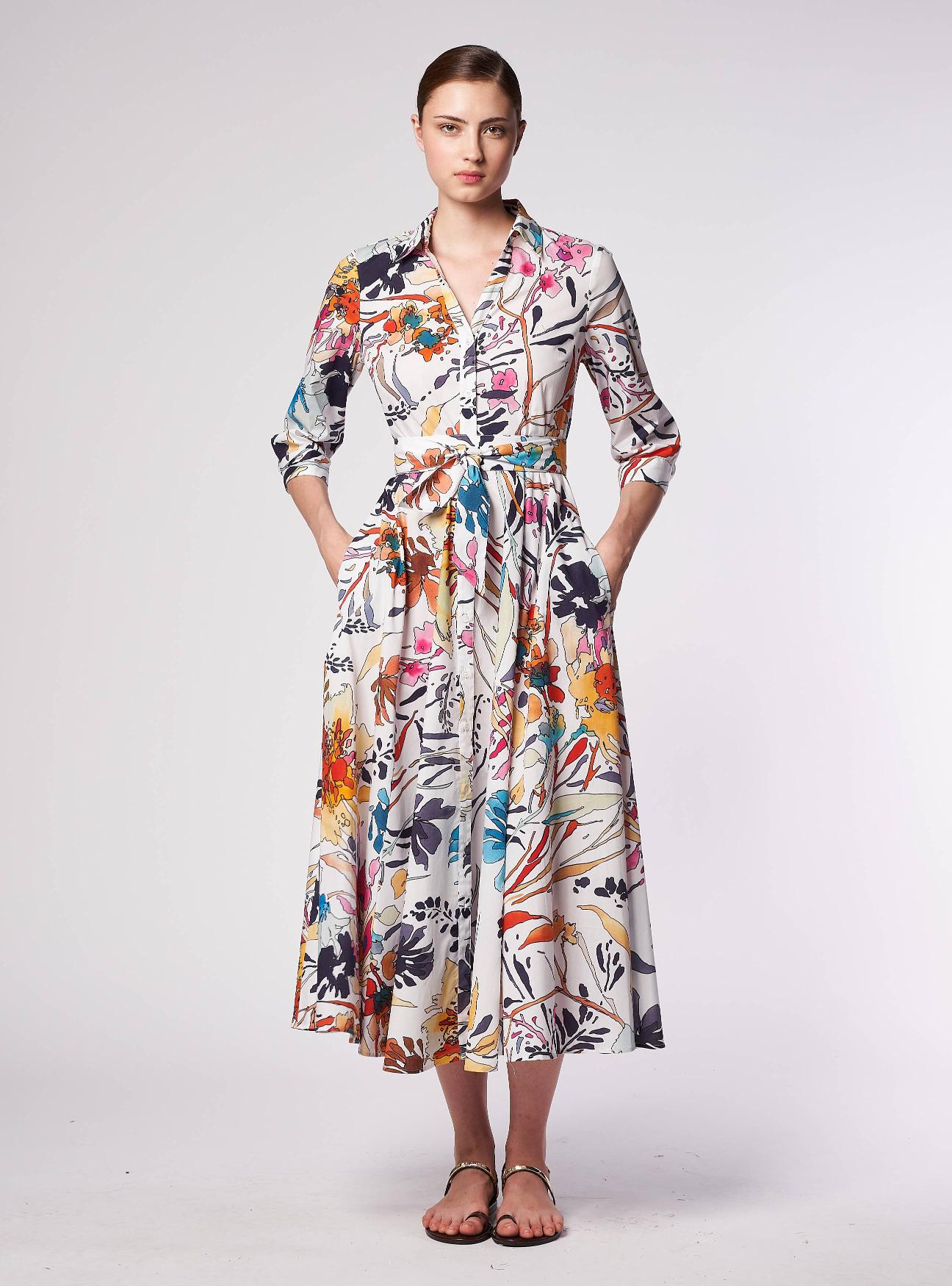 Long shirt dress. Shirt collar, V-neck. Loose waist and wide hem, vertical seams. Short 3/4 sleeves with one-button cuffs. Long dress. Self-tie belt to accentuate the waist.