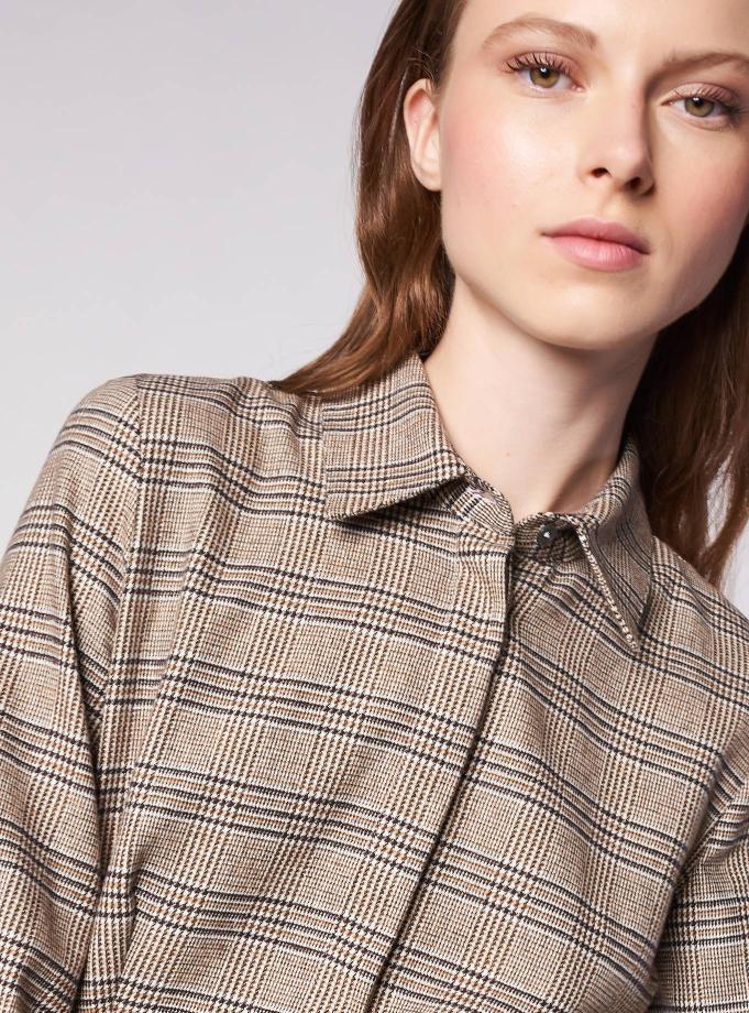 Shirt dress, regular fit with cut at the waist and wide flare at the bottom. Regular shoulder, sleeves with slight puff at the bottom, two-button cuff. Shirt collar, English lacing. Matching belt to tie to emphasize the waistline. Yoke in the back. Pockets inserted in the side. Midi length.