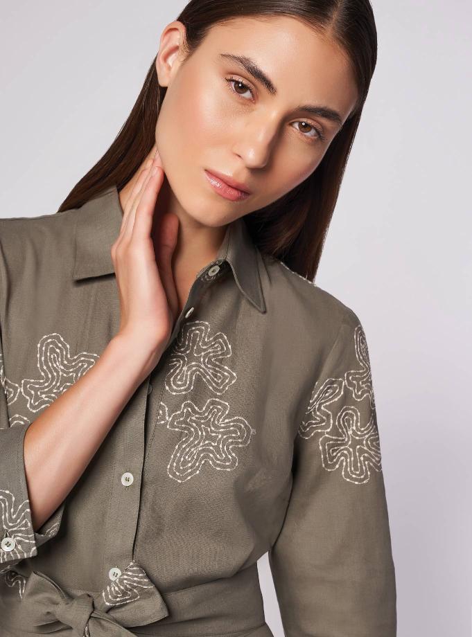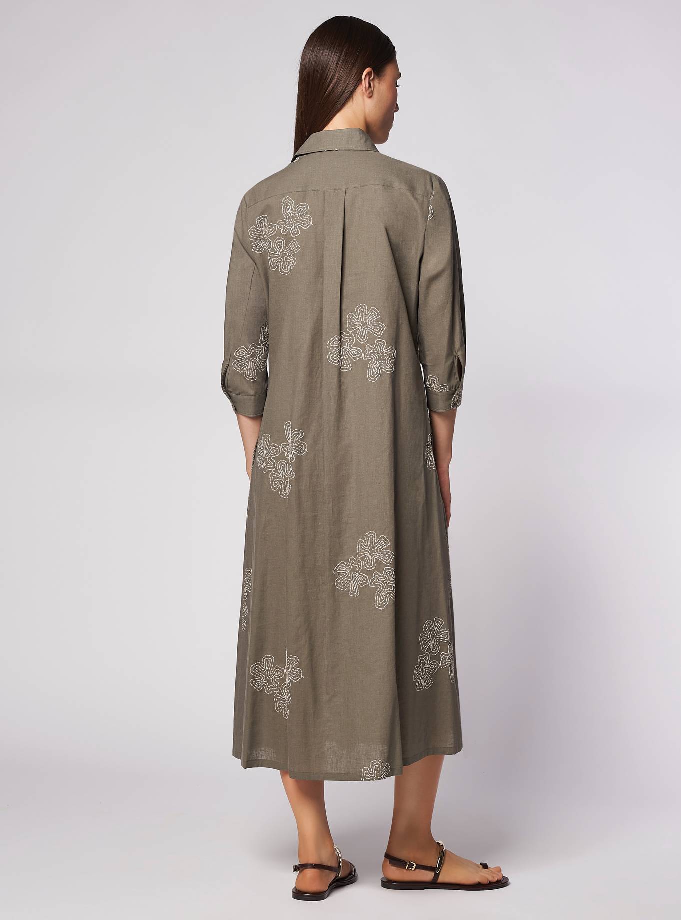 Chemisier dress, slightly slim fit at the top and wide flaring at the bottom. Shirt collar with "V" neckline.