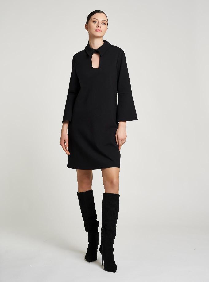 A-line dress, above the knee length. Shirt collar, drop in front, regular shoulder, long sleeves flared at the bottom.
