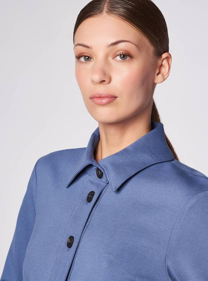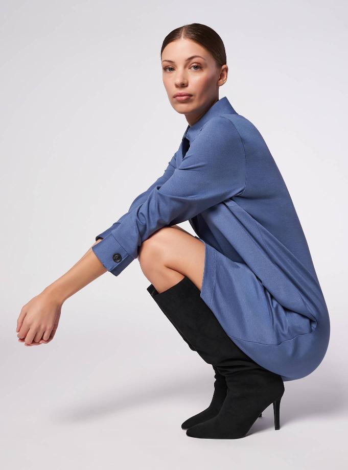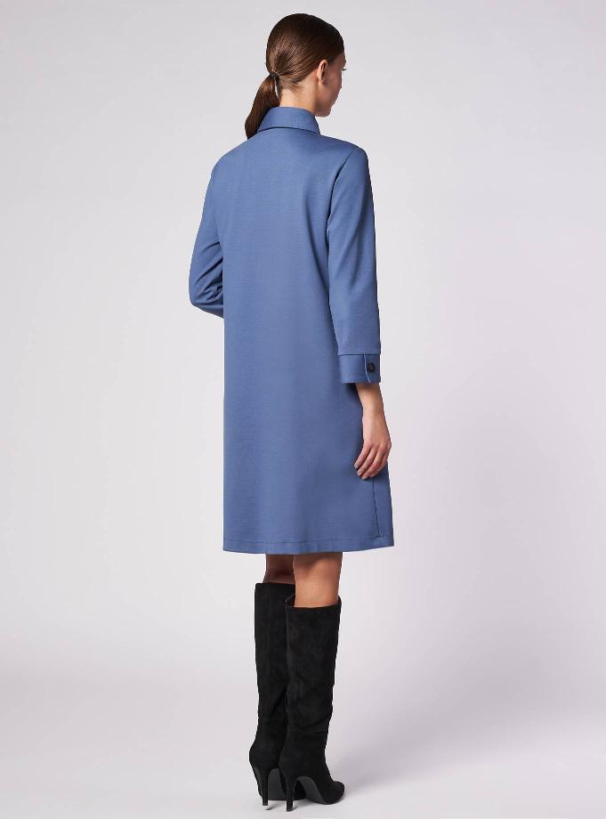 Regular fit dress, knee length, slightly flared at the bottom. Regular shoulders, shirt collar, polo tie. Three-quarter sleeve with buttoned cuff. Pockets inserted in the side.
