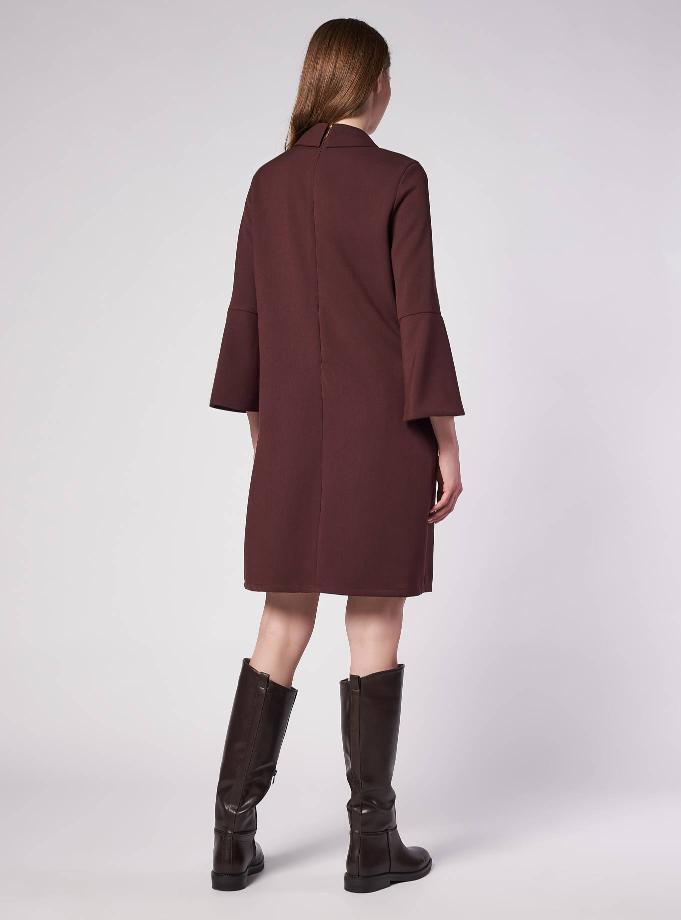 A-line dress, above the knee length. Shirt collar, drop in front, regular shoulder, long sleeves flared at the bottom.