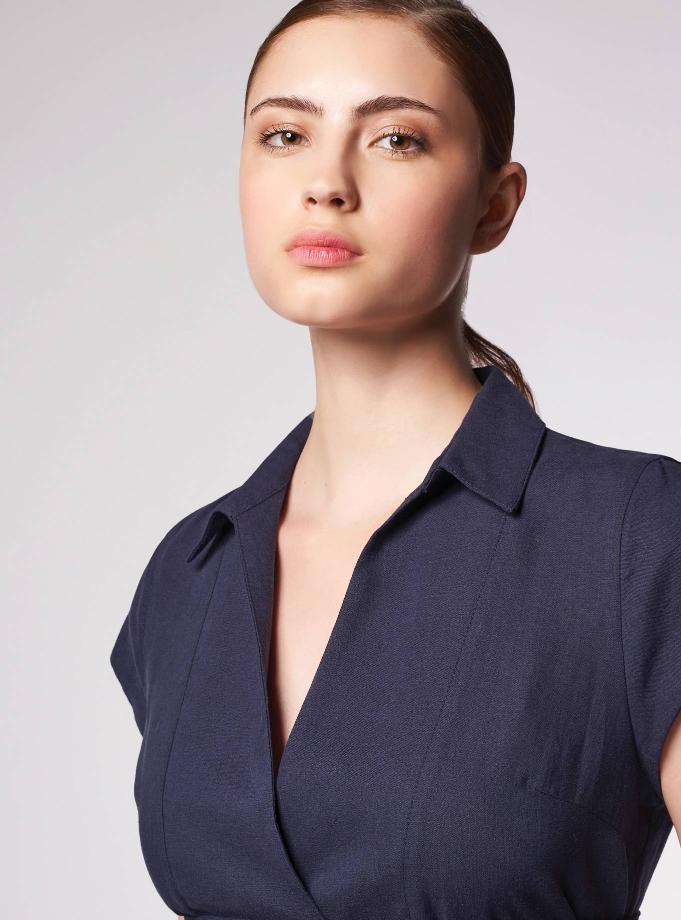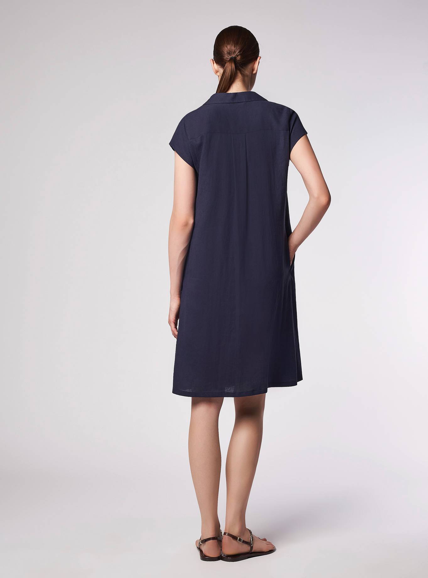 A-line dress with a shirt collar and cap sleeves. V-neckline and front pleat. Matching belt in the same fabric to tie at the waist.
