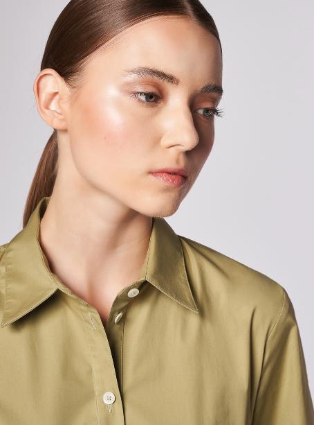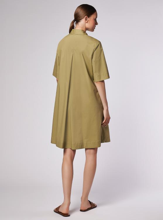 A-line dress with a shirt collar and short sleeves. Regular fit at the chest and shoulders, flared at the hem. Deep pleat at the back. Knee-length.