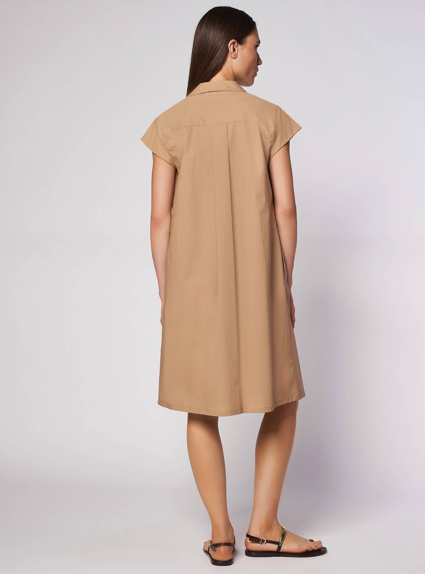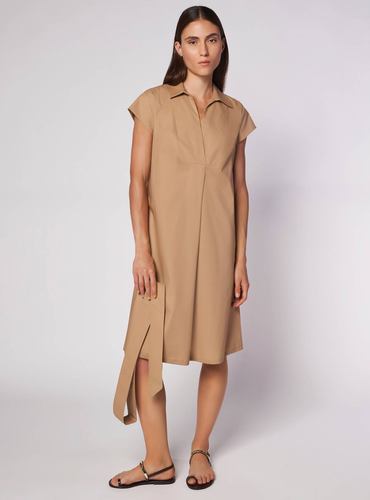A-line dress with a shirt collar and cap sleeves. V-neckline and front pleat. Matching belt in the same fabric to tie at the waist.