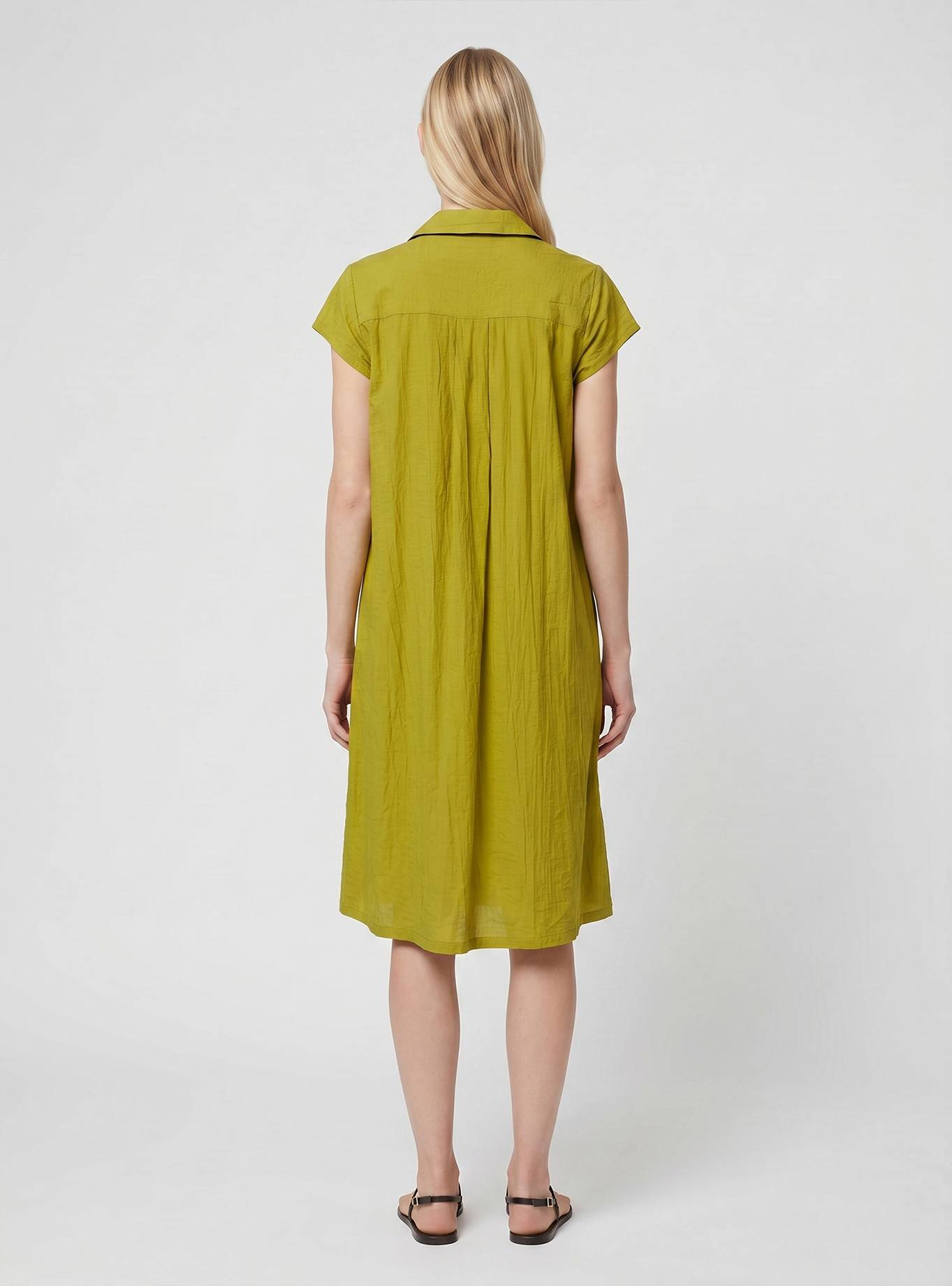 A-line dress with a shirt collar and cap sleeves. V-neckline and front pleat. Matching belt in the same fabric to tie at the waist.