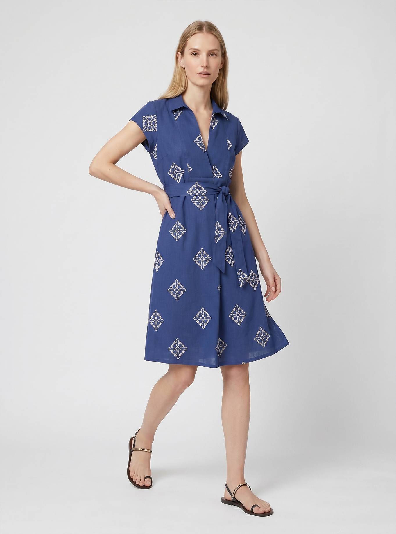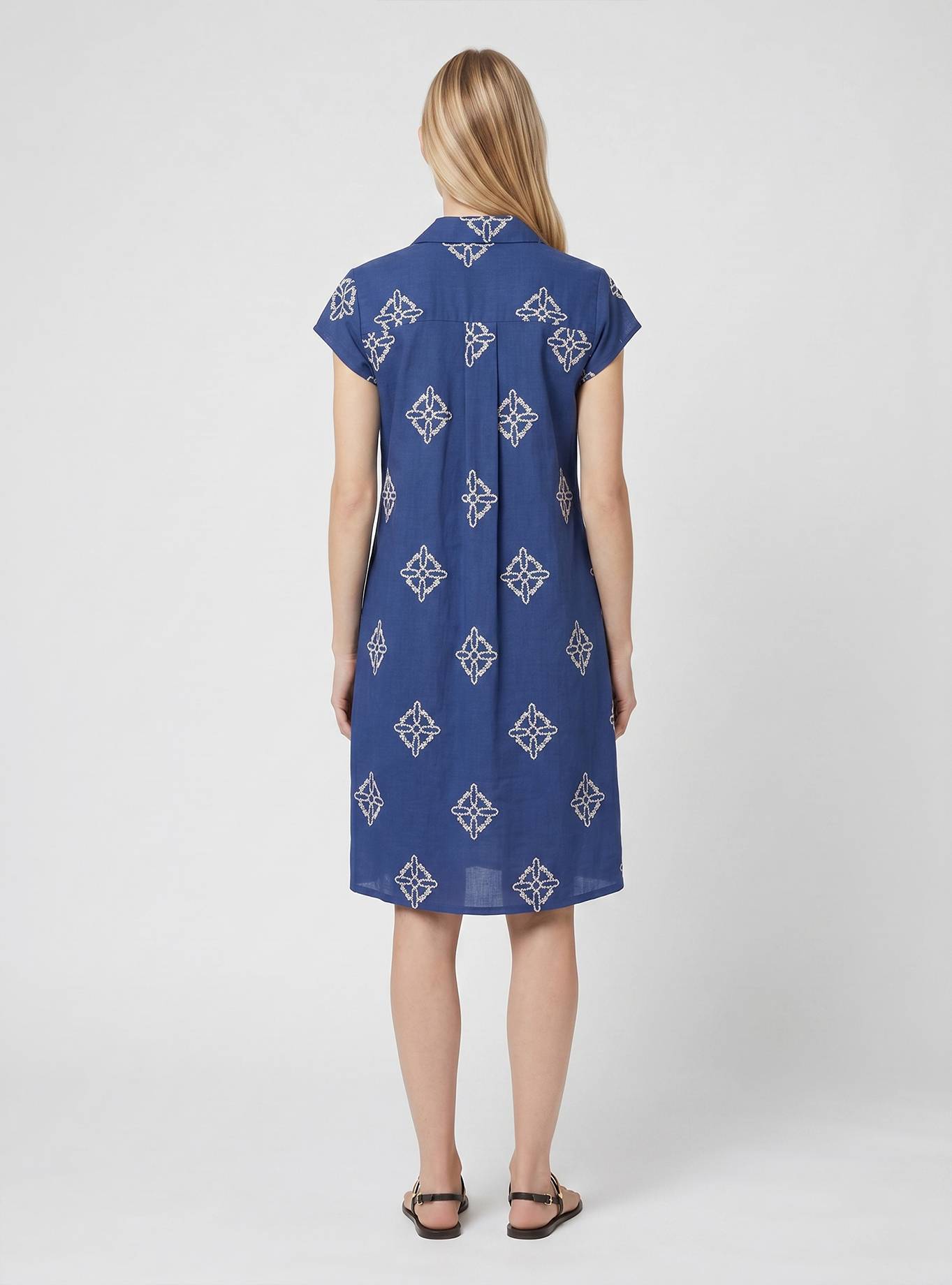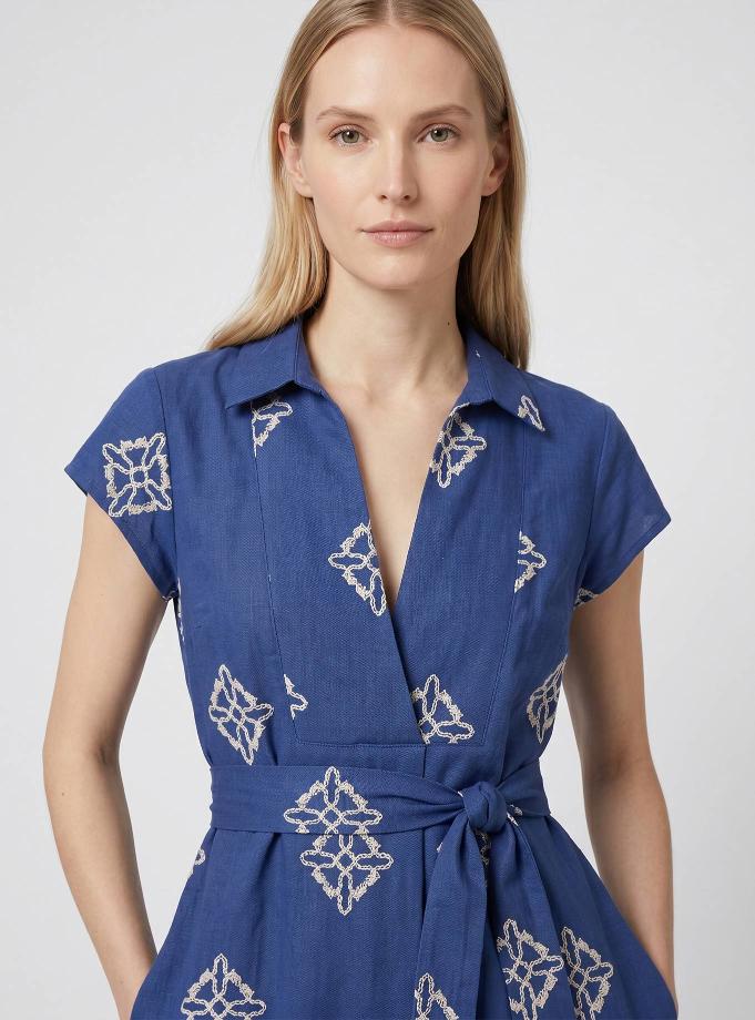 A-line dress with a shirt collar and cap sleeves. V-neckline and front pleat. Matching belt in the same fabric to tie at the waist.