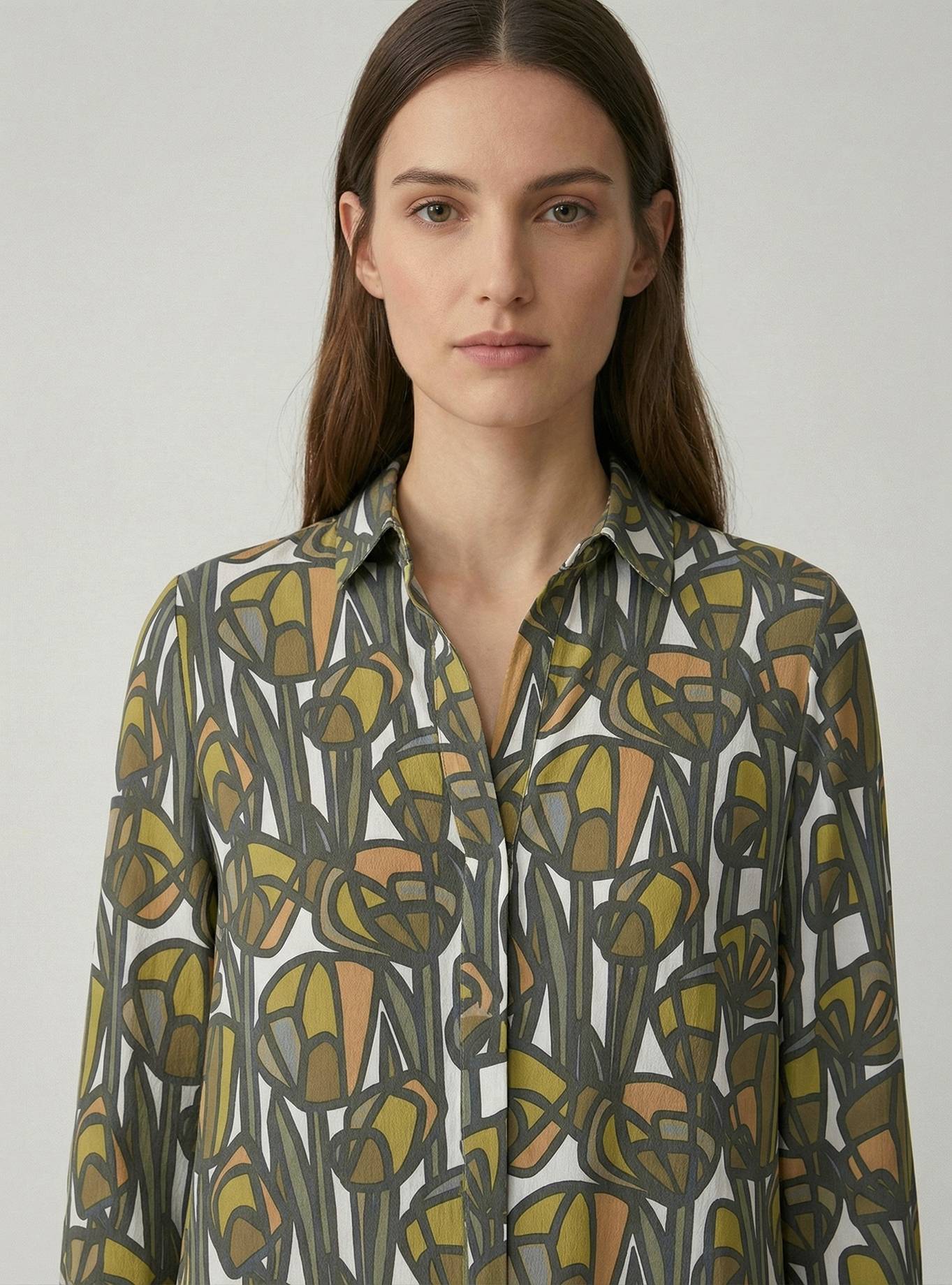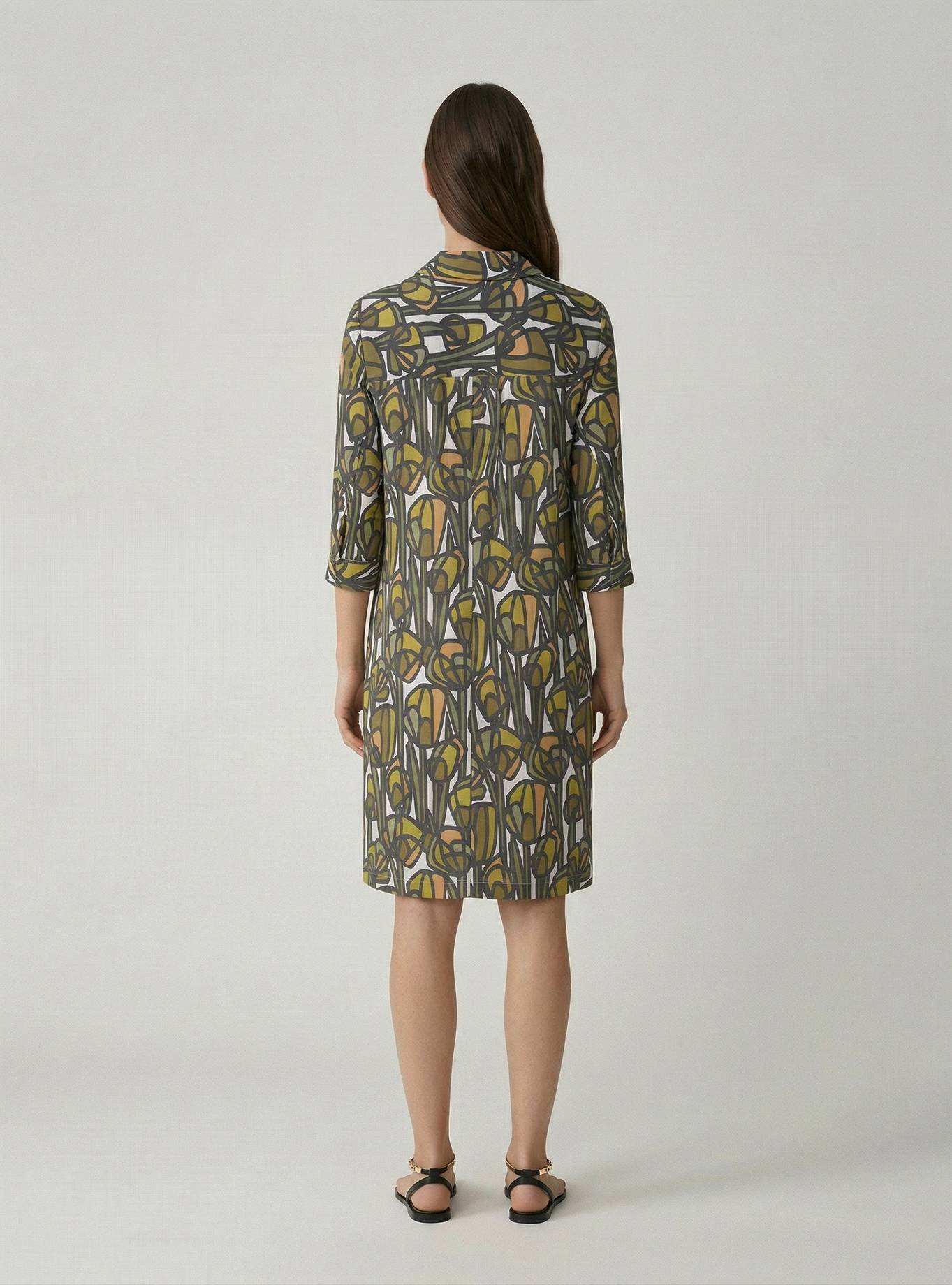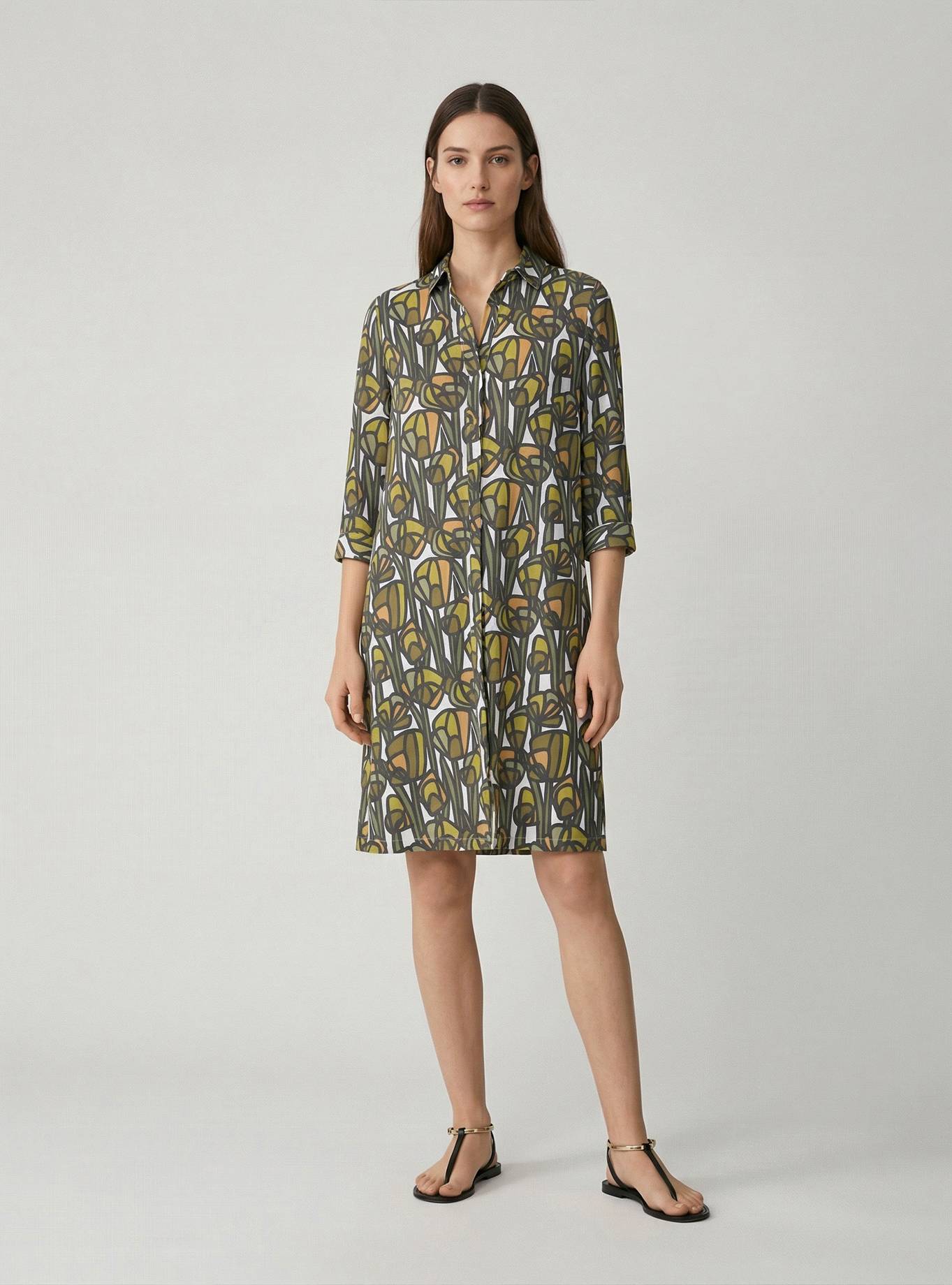 A-line dress with shirt collar and polo neckline. 3/4 sleeves. Knee-length, pleated front.