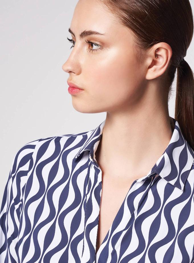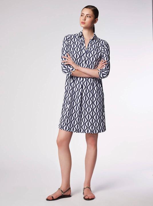 A-line dress with shirt collar and polo neckline. 3/4 sleeves. Knee-length, pleated front.