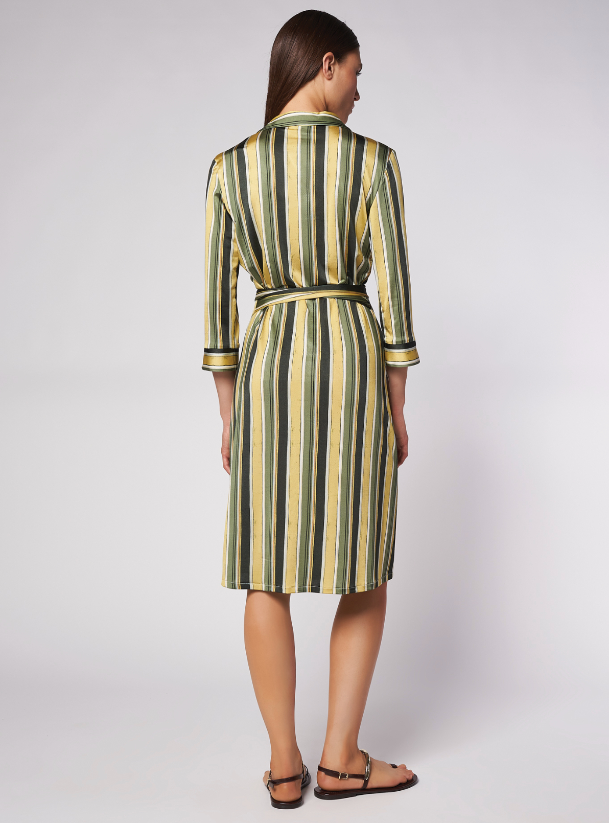 Tight fit wallet dress with cross neckline and shirt collar. Fixed fabric belt at the waist, to enrich the look and emphasize the silhouette.