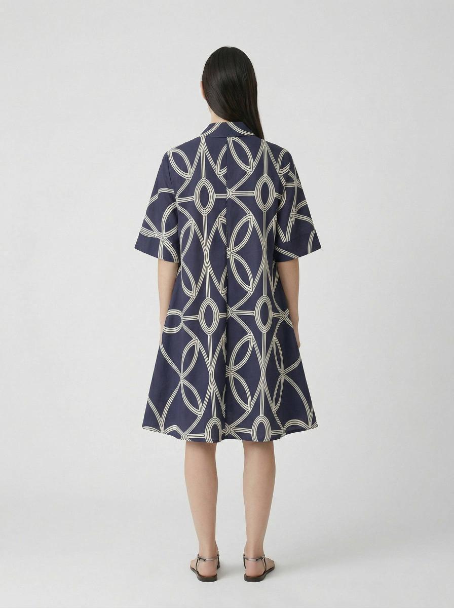A-line dress with a shirt collar and short sleeves. Regular fit at the chest and shoulders, flared at the hem. Deep pleat at the back. Knee-length.