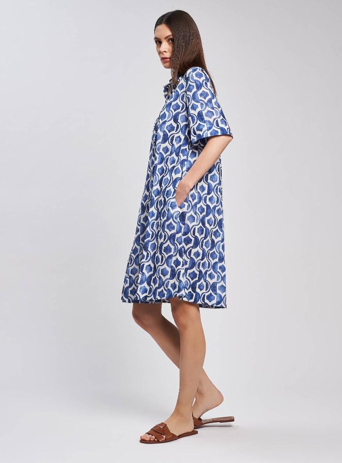 A-line dress with a shirt collar and short sleeves. Regular fit at the chest and shoulders, flared at the hem. Deep pleat at the back. Knee-length.