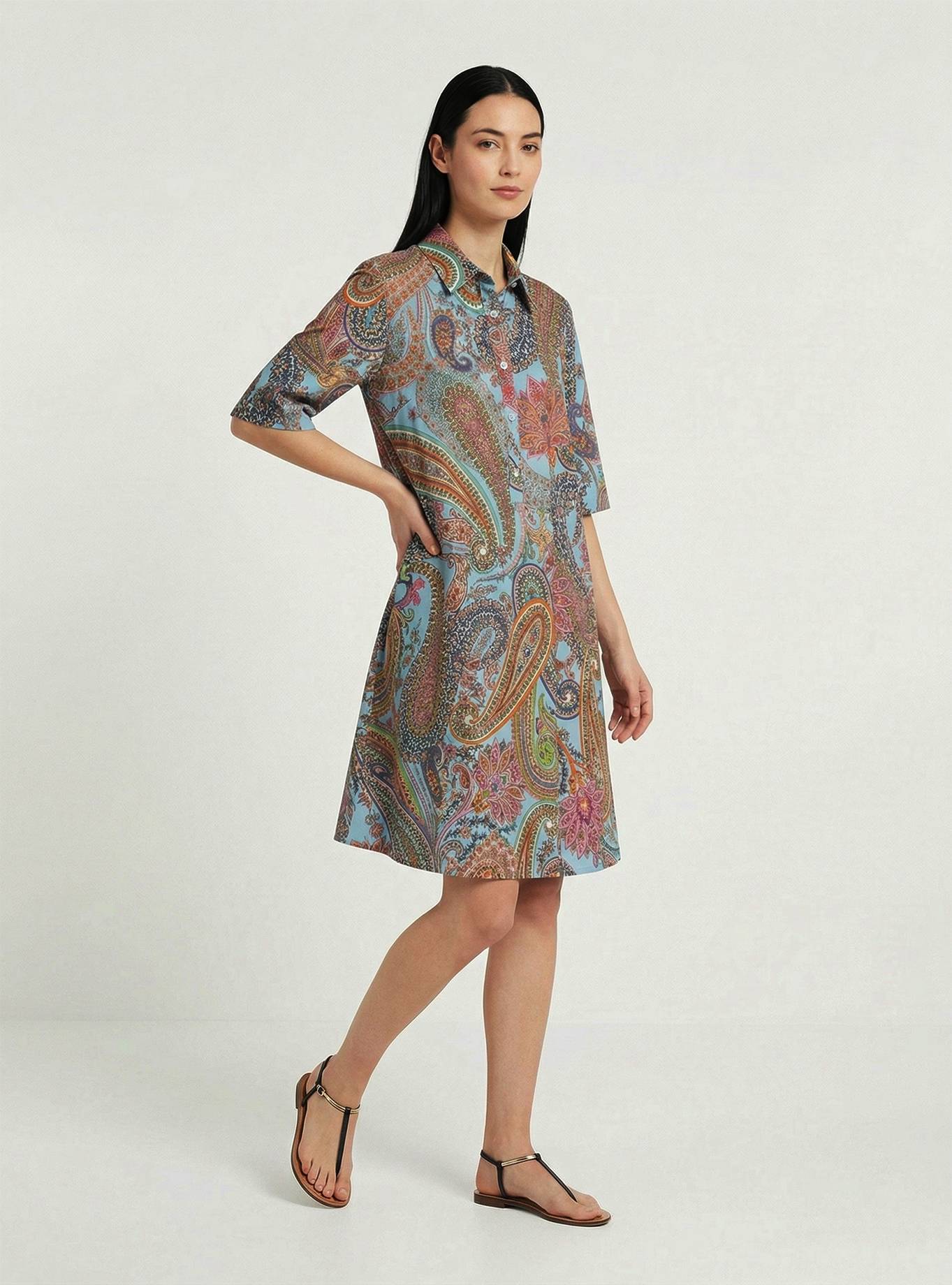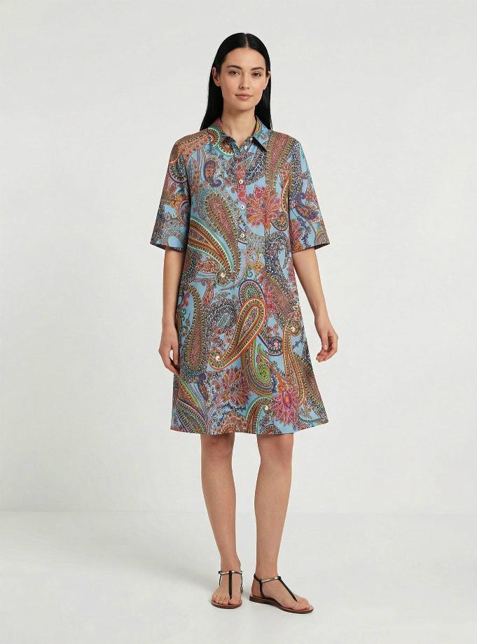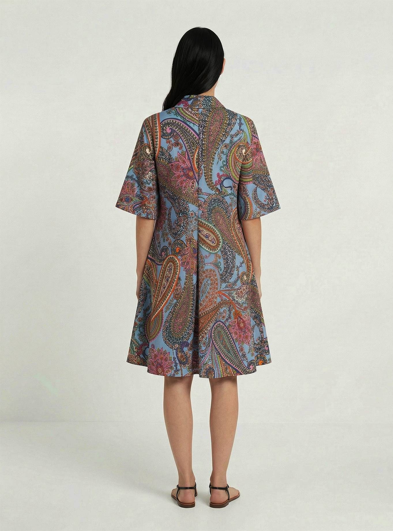 A-line dress with a shirt collar and short sleeves. Regular fit at the chest and shoulders, flared at the hem. Deep pleat at the back. Knee-length.