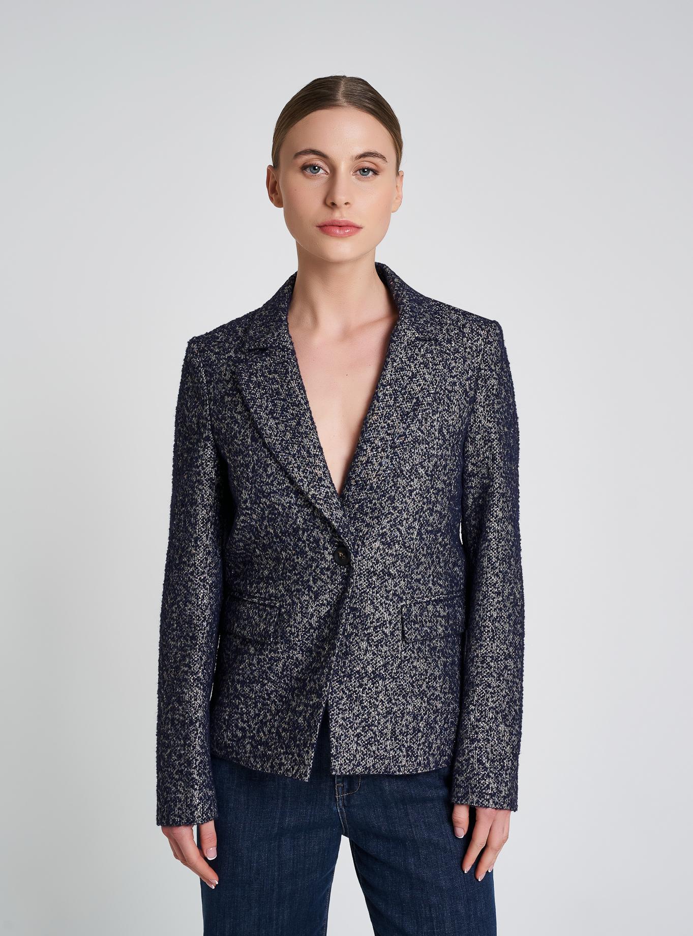 Regular fit jacket. Single-breasted one button, deep V-lapels. Flap pockets on the front. Regular shoulder and sleeve. Side panels on the back. Medium-low sidewall length.