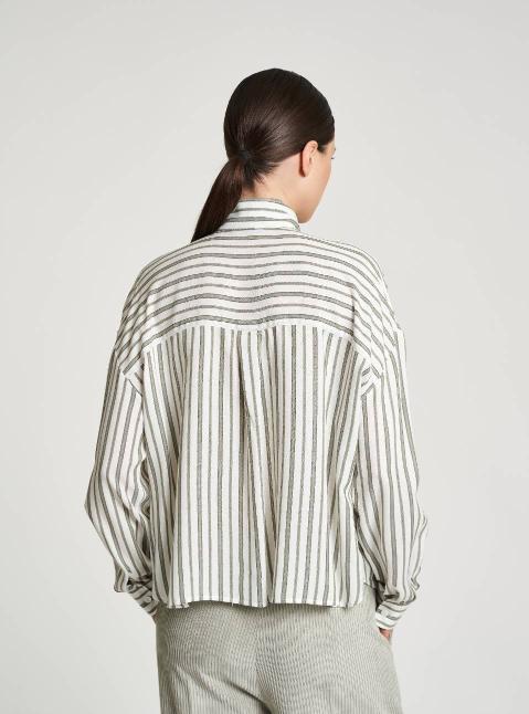 Loose fit shirt. Collar with adjustable bow. Dropped shoulder with low turn, soft sleeve with cuff and a button. Back yoke with cannon.