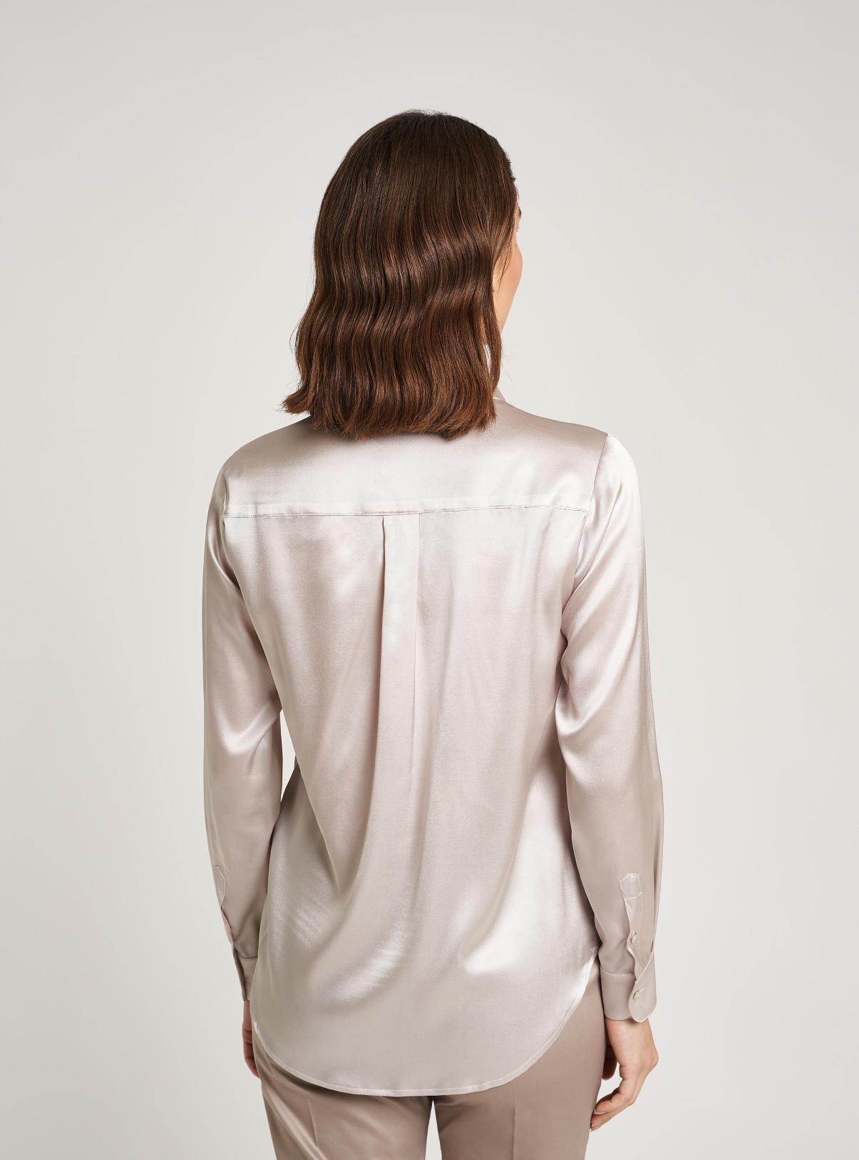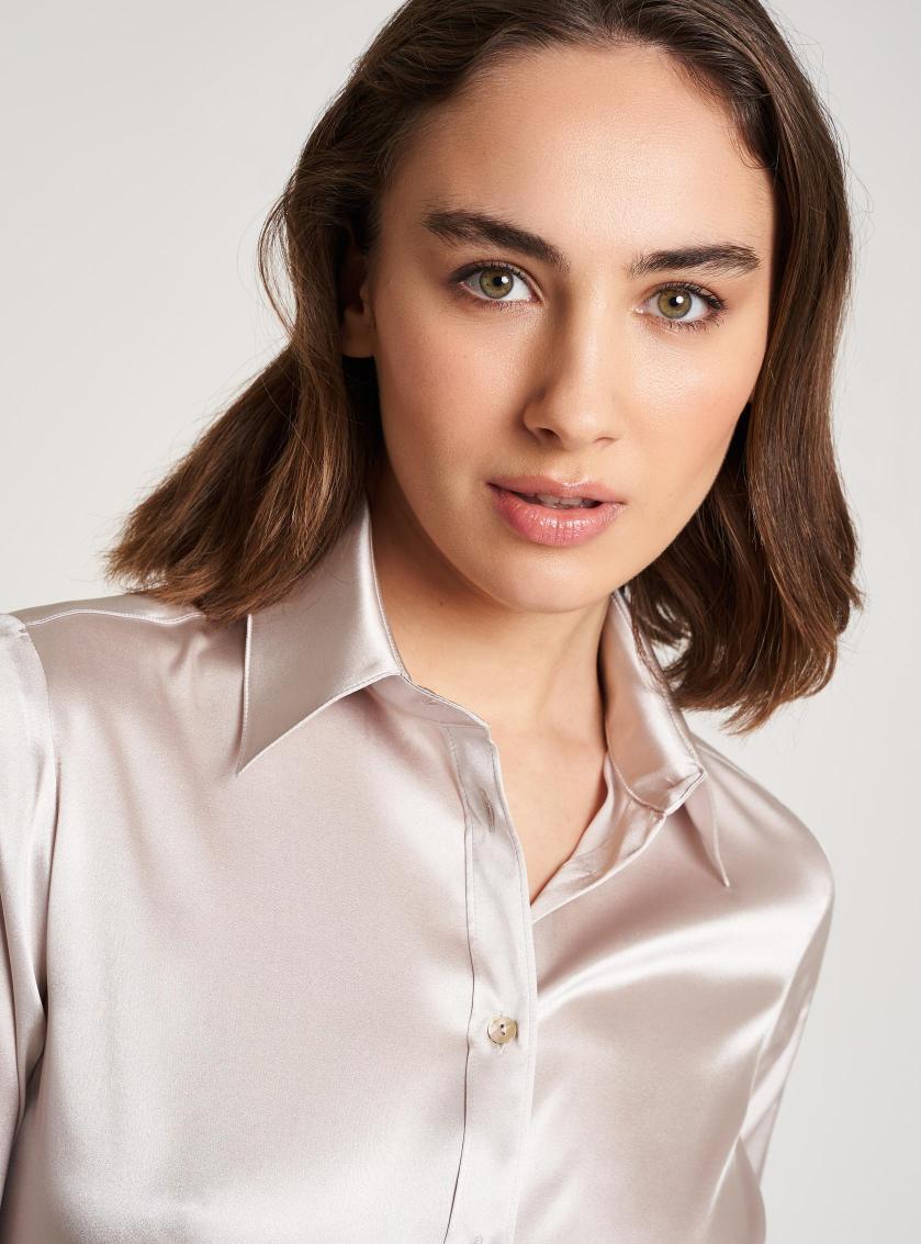 Loose-fit shirt. Shirt collar . Regular sleeves with cuff, button and placket. Yoke with placket on the back. Long shirt, low hip length.