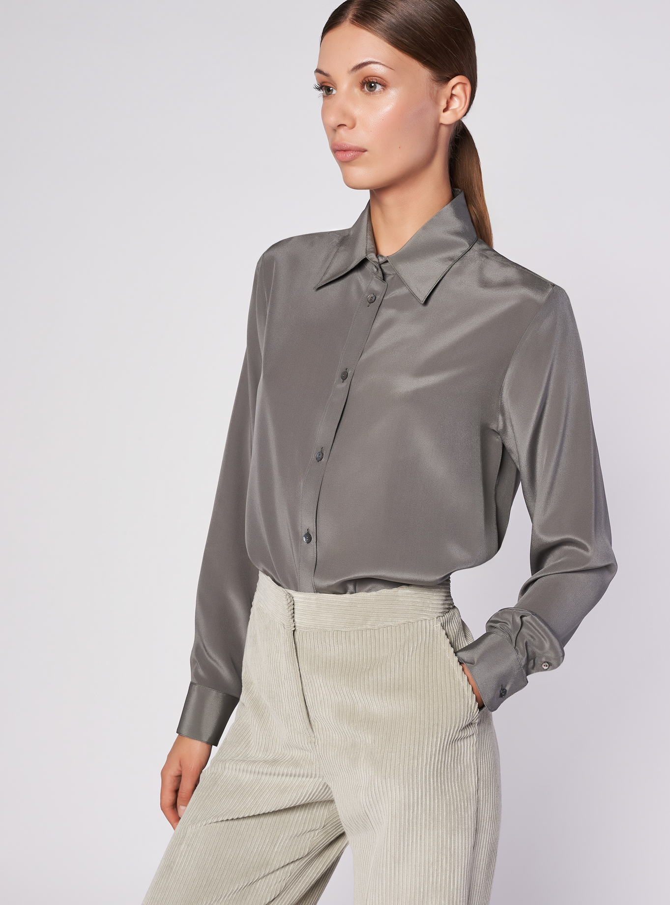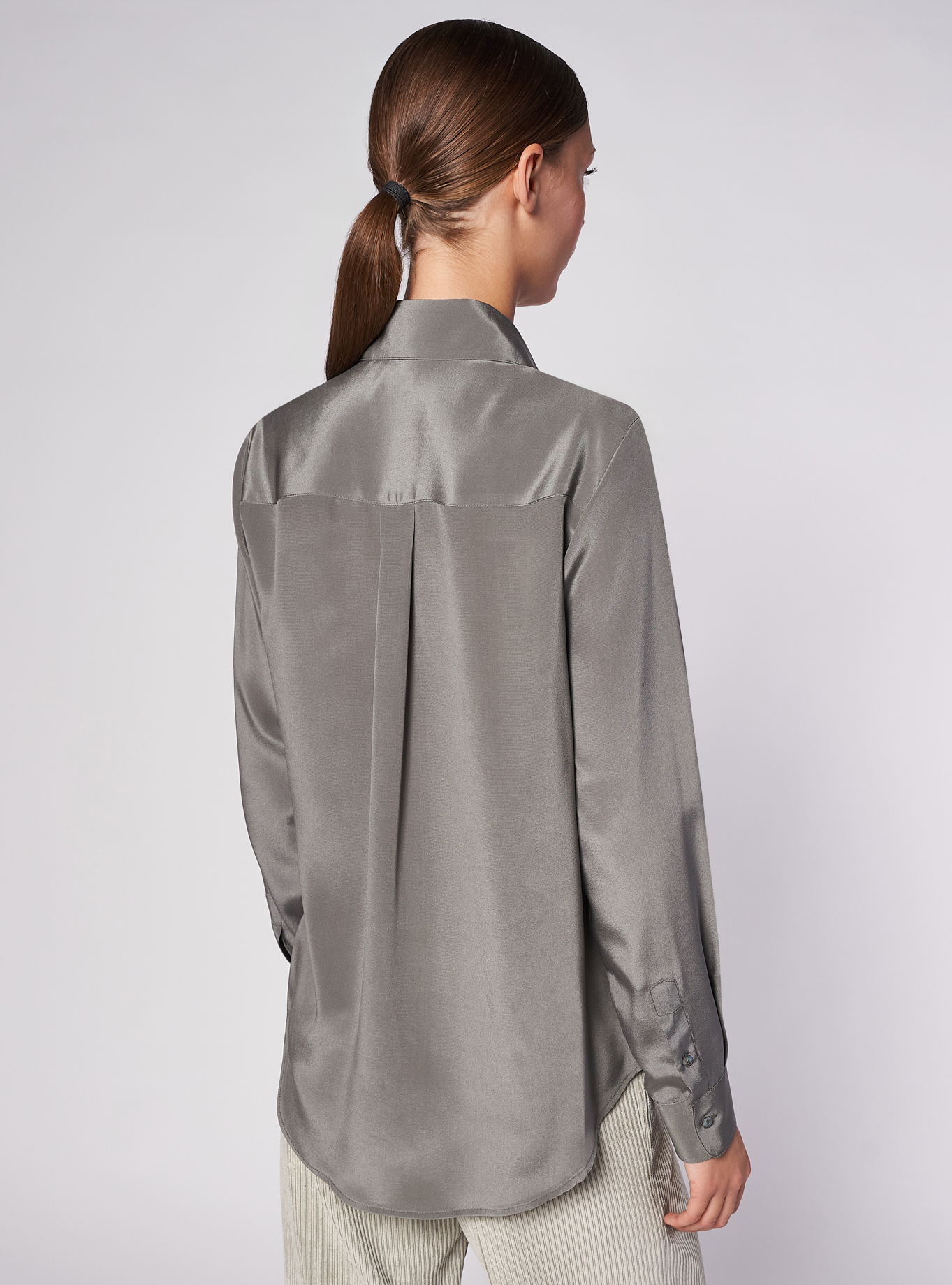 Loose-fit shirt. Shirt collar . Regular sleeves with cuff, button and placket. Yoke with placket on the back. Long shirt, low hip length.