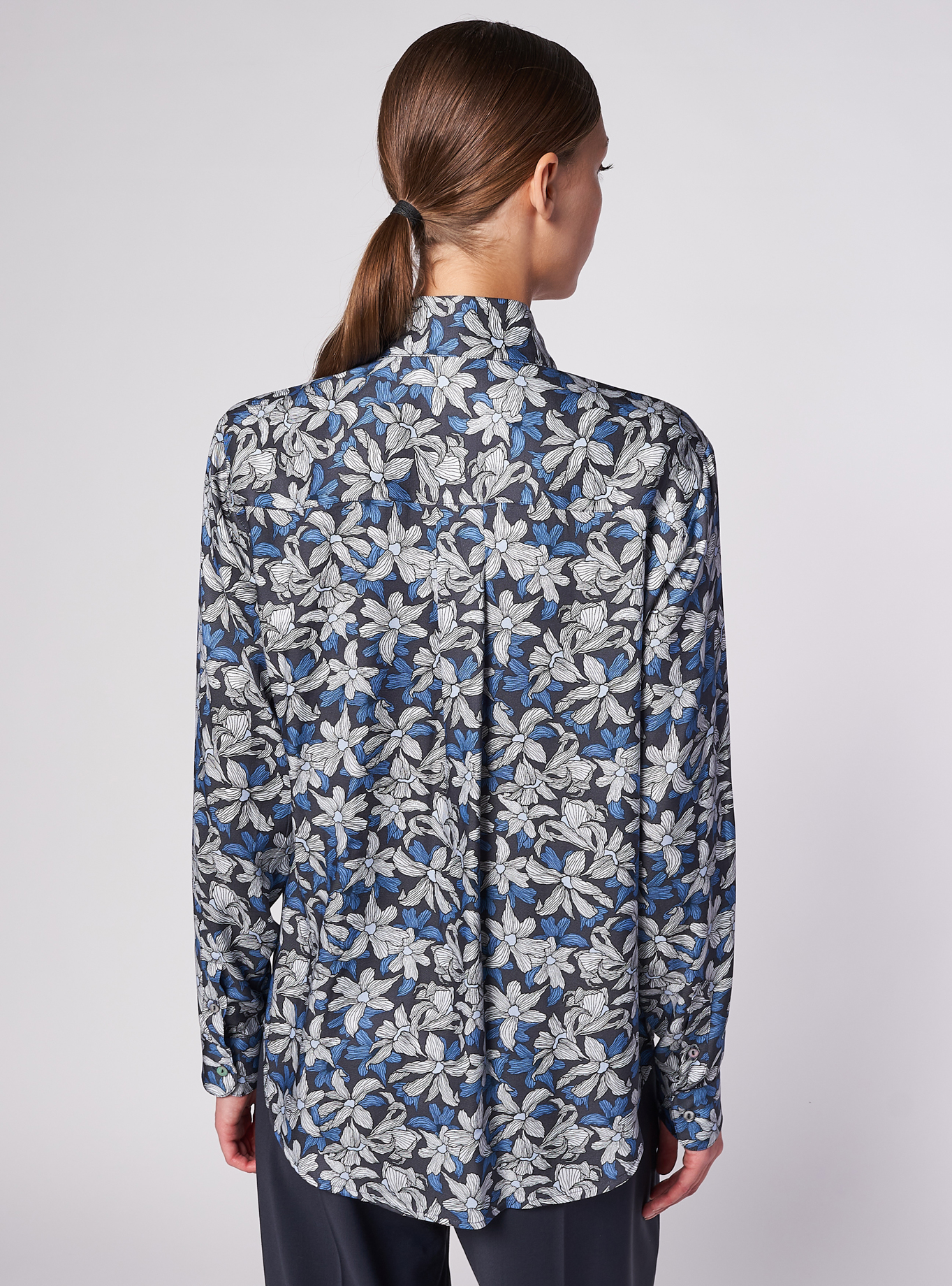 Loose-fit shirt. Shirt collar . Regular sleeves with cuff, button and placket. Yoke with placket on the back. Long shirt, low hip length.