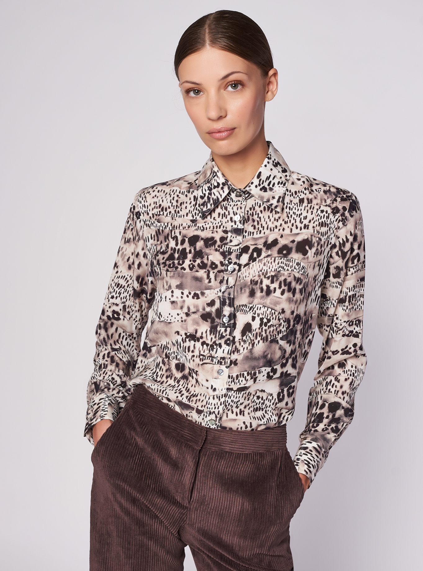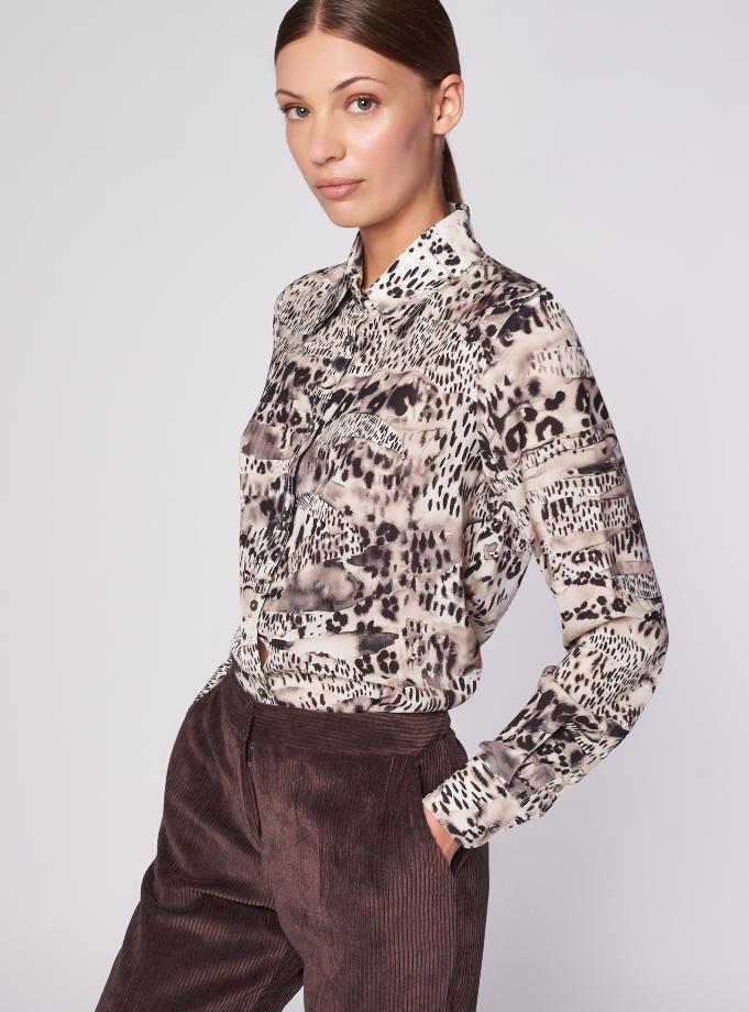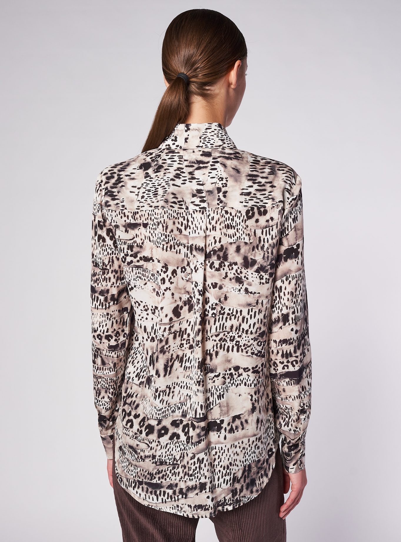 Loose-fit shirt. Shirt collar . Regular sleeves with cuff, button and placket. Yoke with placket on the back. Long shirt, low hip length.