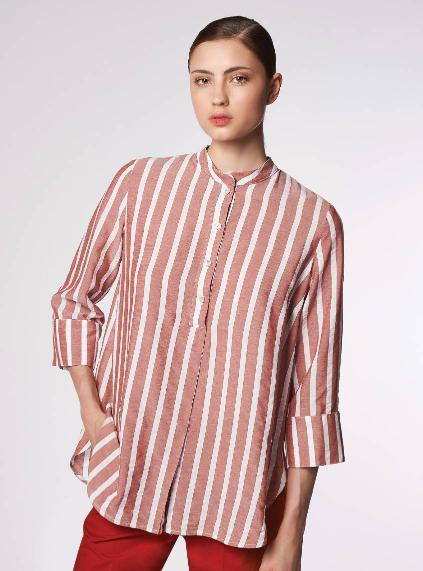 A-line shirt. Regular shoulder, wide 3/4 sleeve with high cuff and two buttons. Korean fastening with visible buttons. Rounded hem. Low hip length.