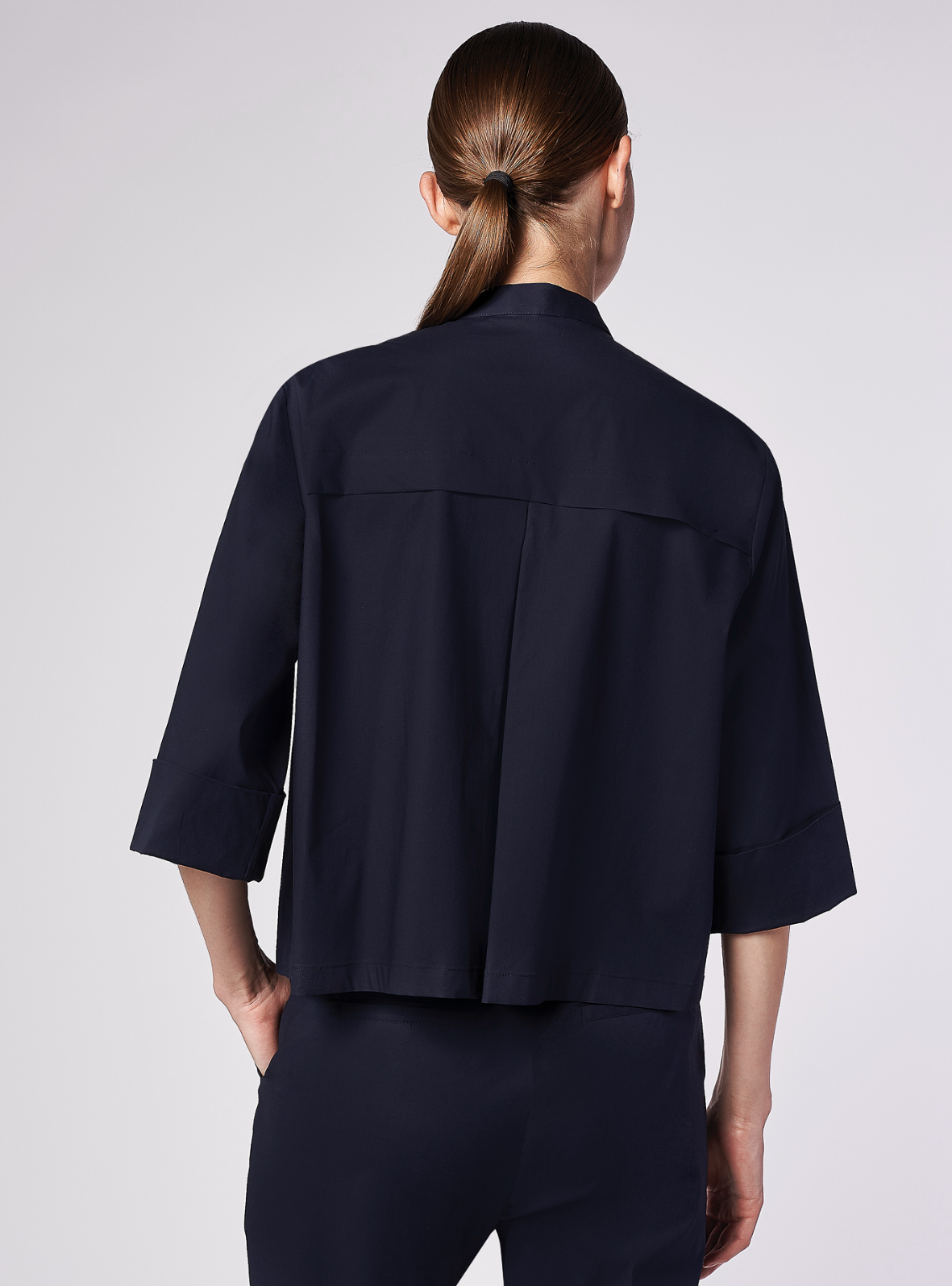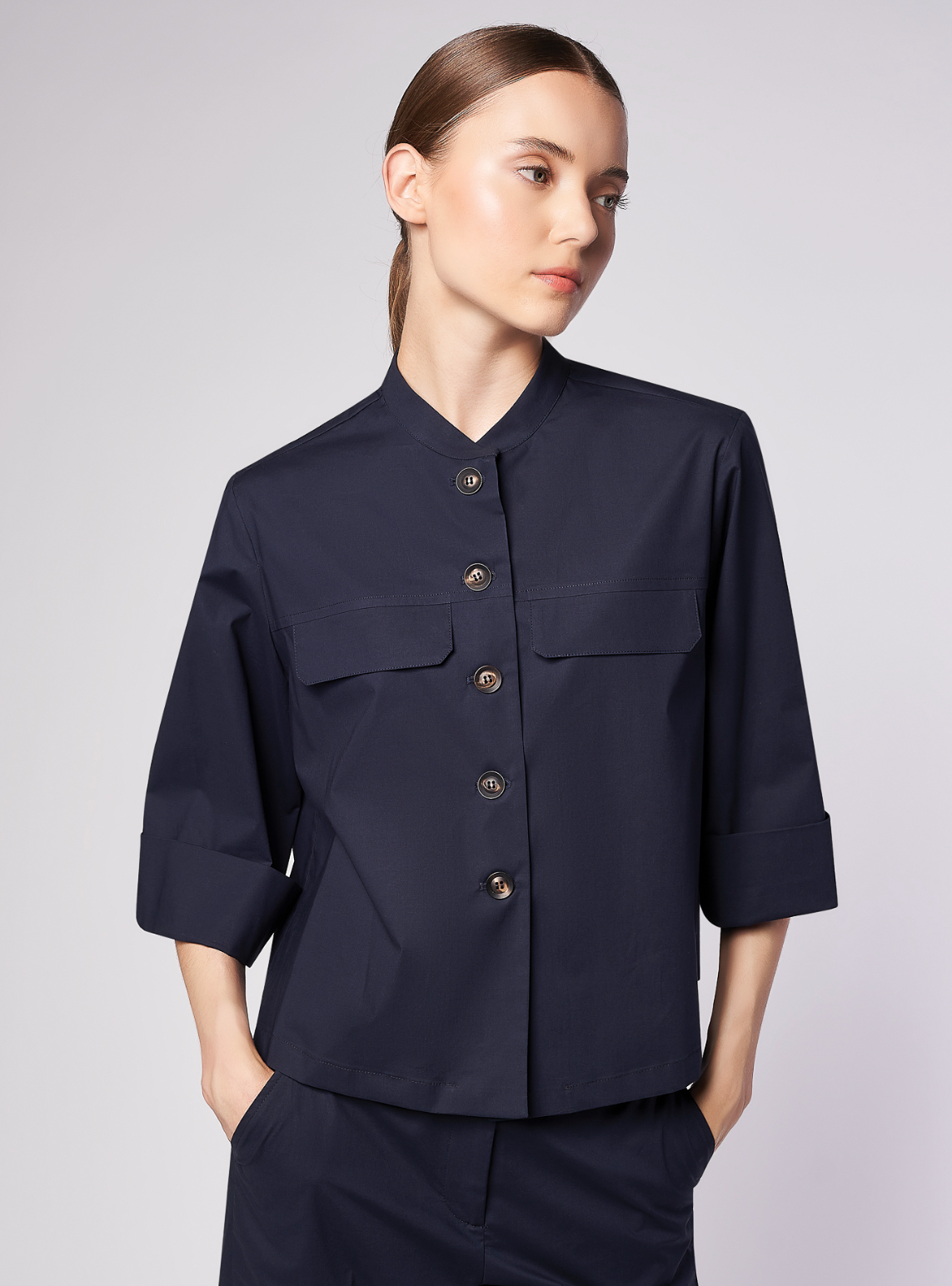 Relaxed-fit shirt with a slightly A-line silhouette. Regular shoulders, wide elbow-length sleeves with high cuffs. Mandarin collar, button placket. Front flap pockets. Pleated back with a counter-pleat underneath for added movement. High hip length.