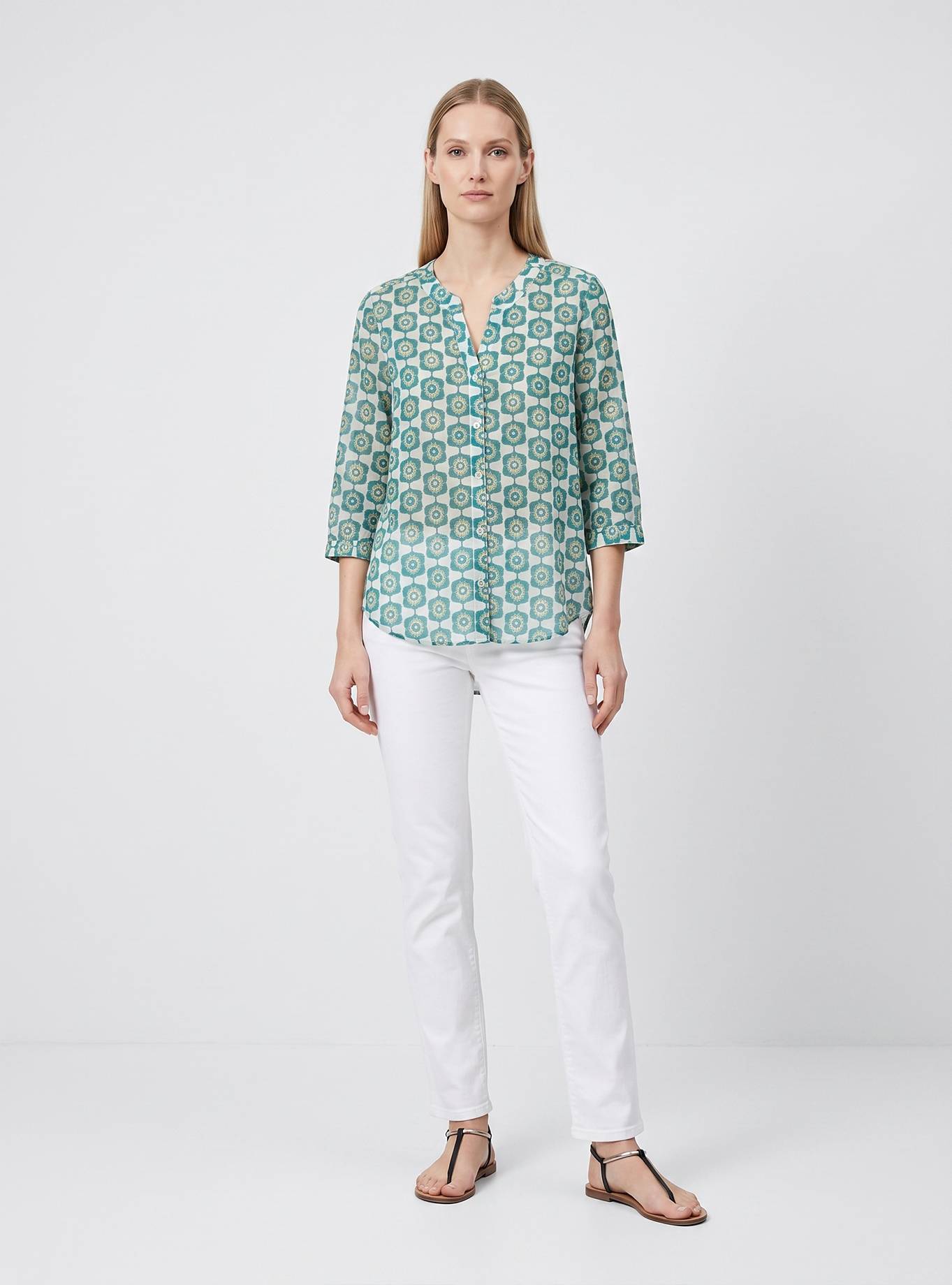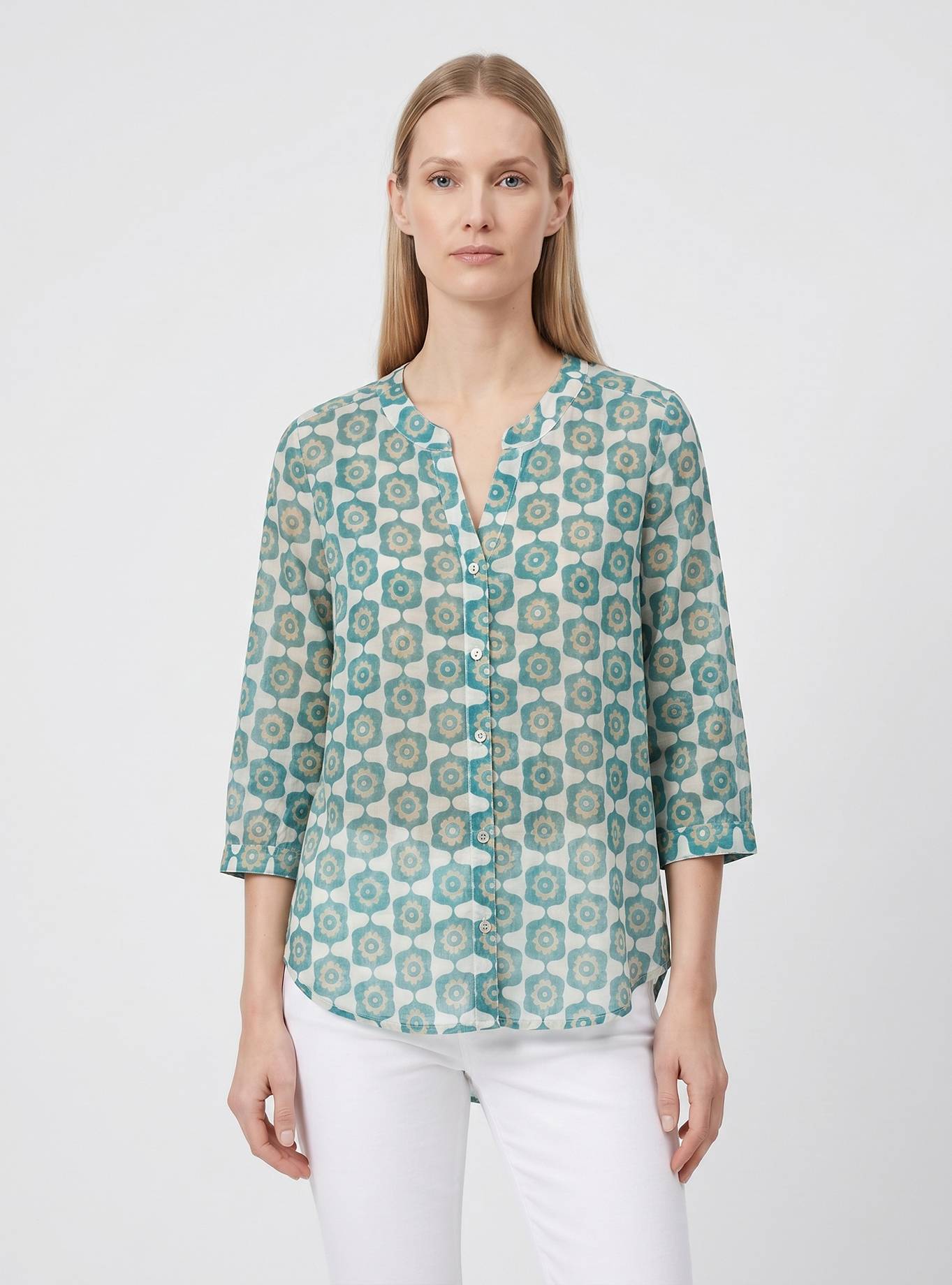 Soft fit shirt. "V" neck with round round Korean strap. Shoulder and regular sleeve, 3/4 short with cuff one button. Carrè behind with counterfold. High flank length.