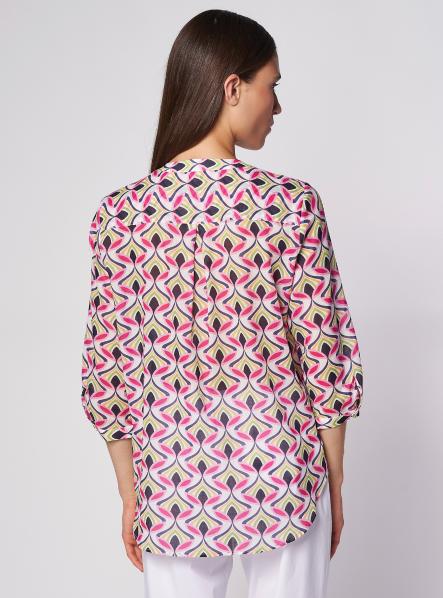 Soft fit shirt. "V" neck with round round Korean strap. Shoulder and regular sleeve, 3/4 short with cuff one button. Carrè behind with counterfold. High flank length.