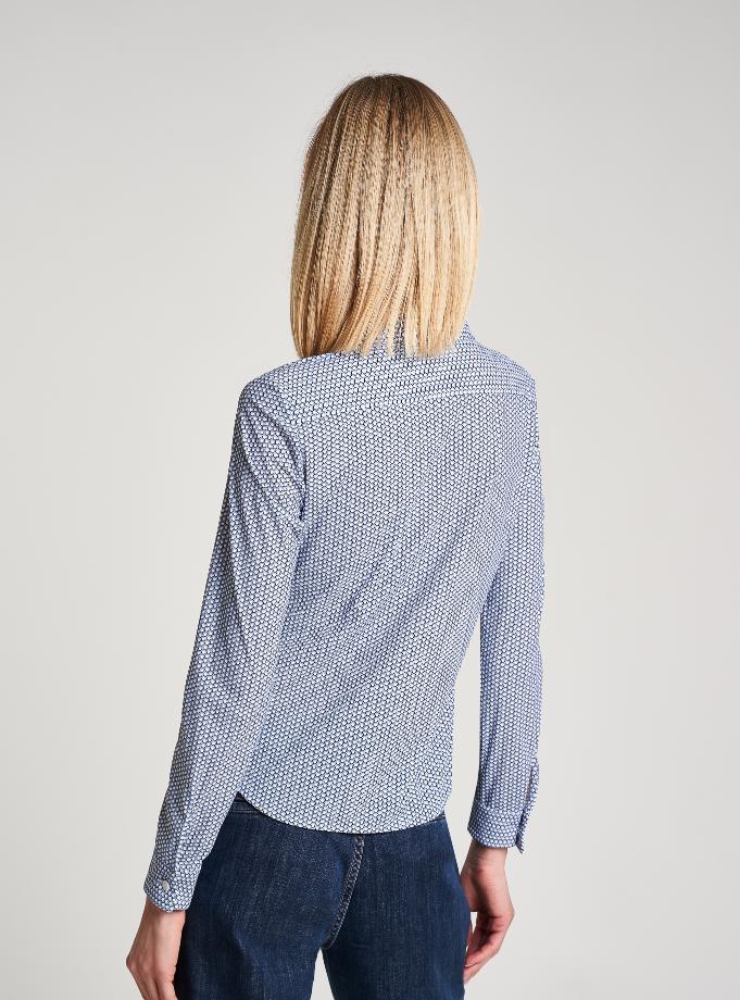 Close-fitting shirt. Shirt collar, polo tie. Long sleeve with cuff and button. Medium-short shirt, medium-short hip length.