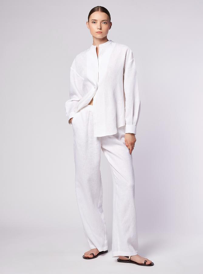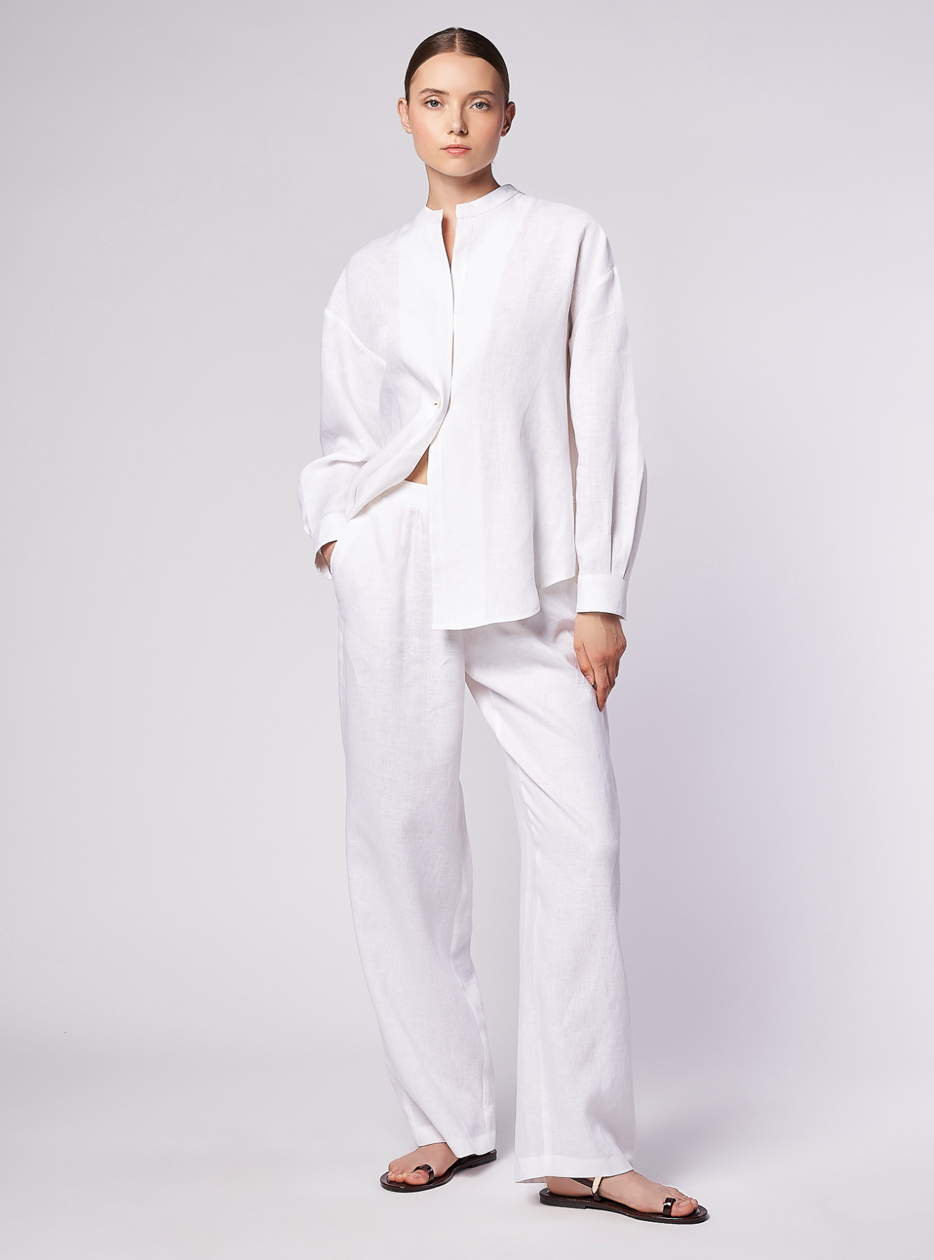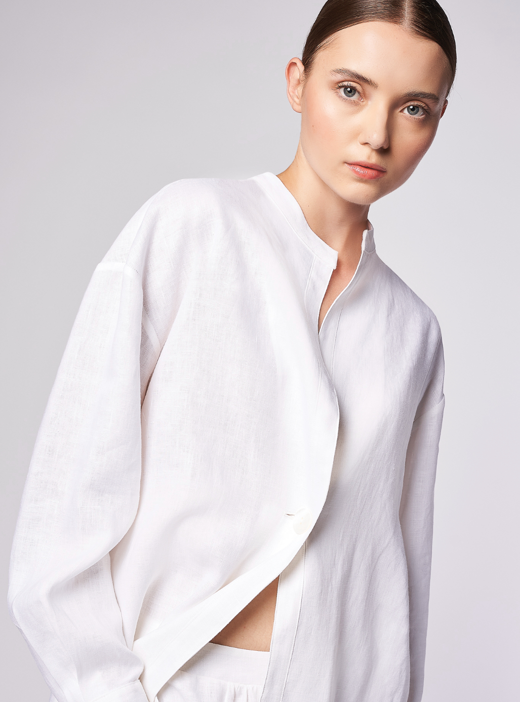 Oversized shirt with dropped shoulders and long sleeves with single-button cuffs. Mandarin neckline. Single-button fastening. Back yoke with pleat. Rounded hem.